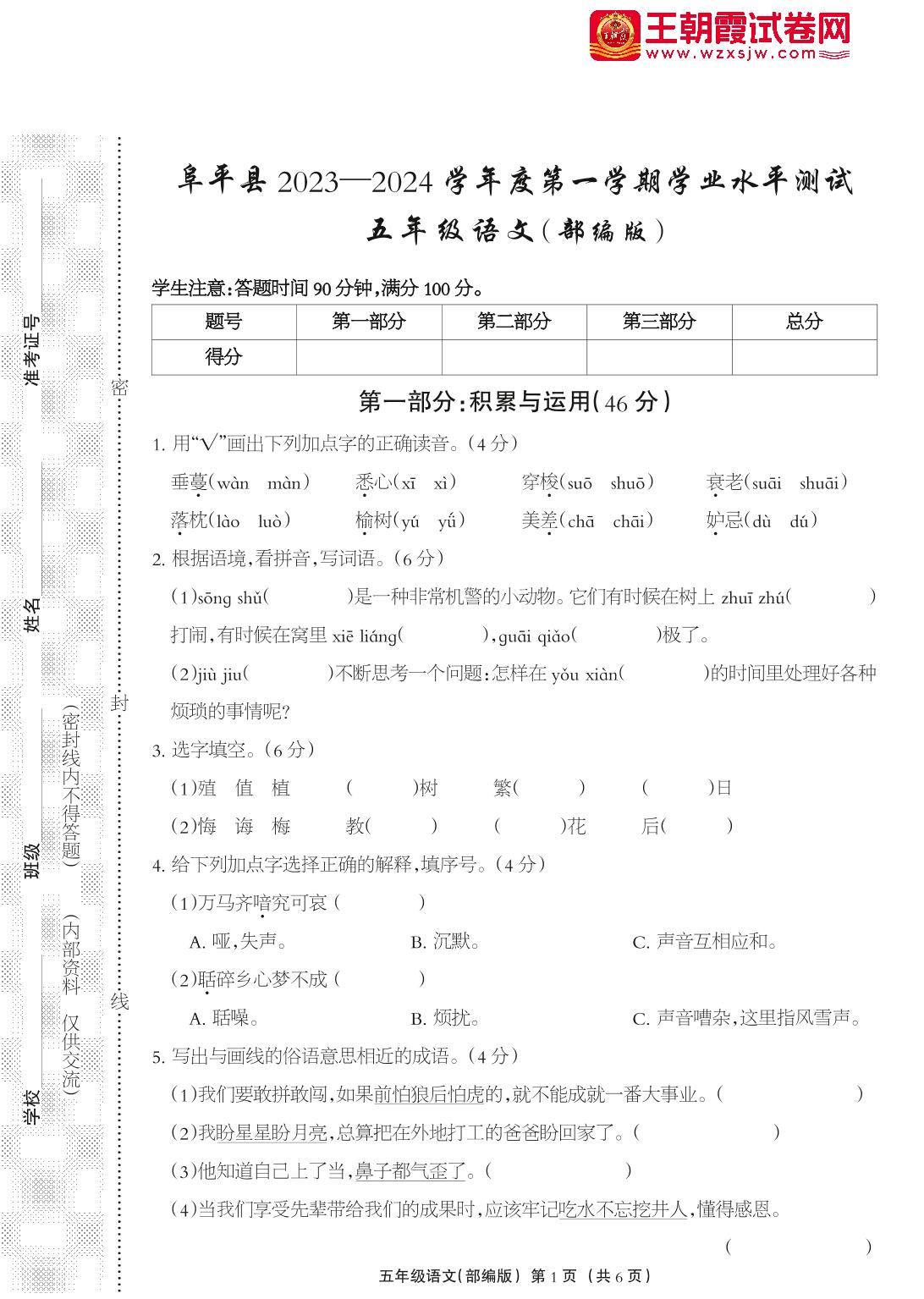 河北省保定市阜平县2023-2024学年度第一学期期末学业水平测试试卷五年级语文(人教版)