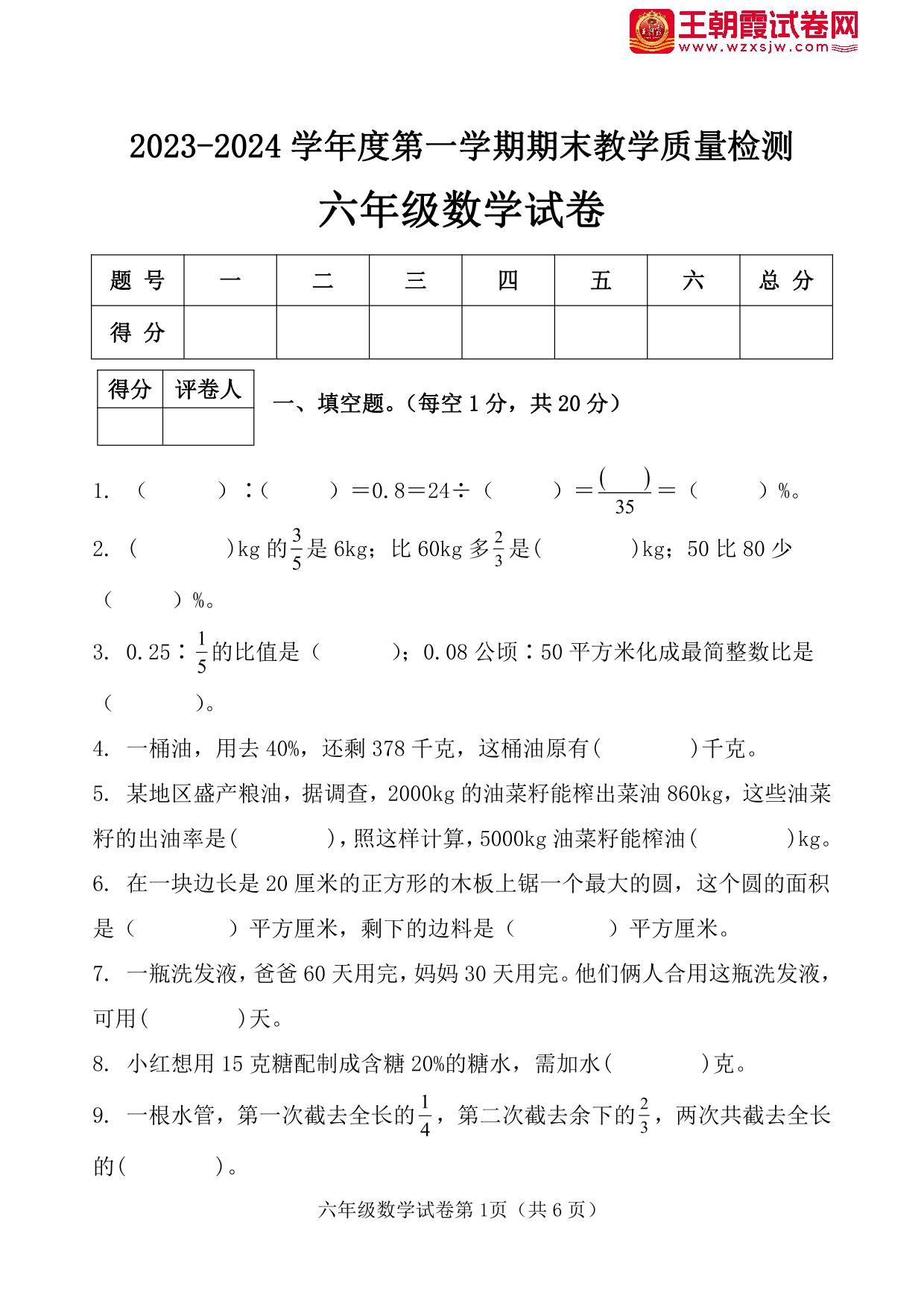 河北省邯郸市永年区2023-2024学年度第一学期期末教学质量检测试卷六年级数学(人教版)