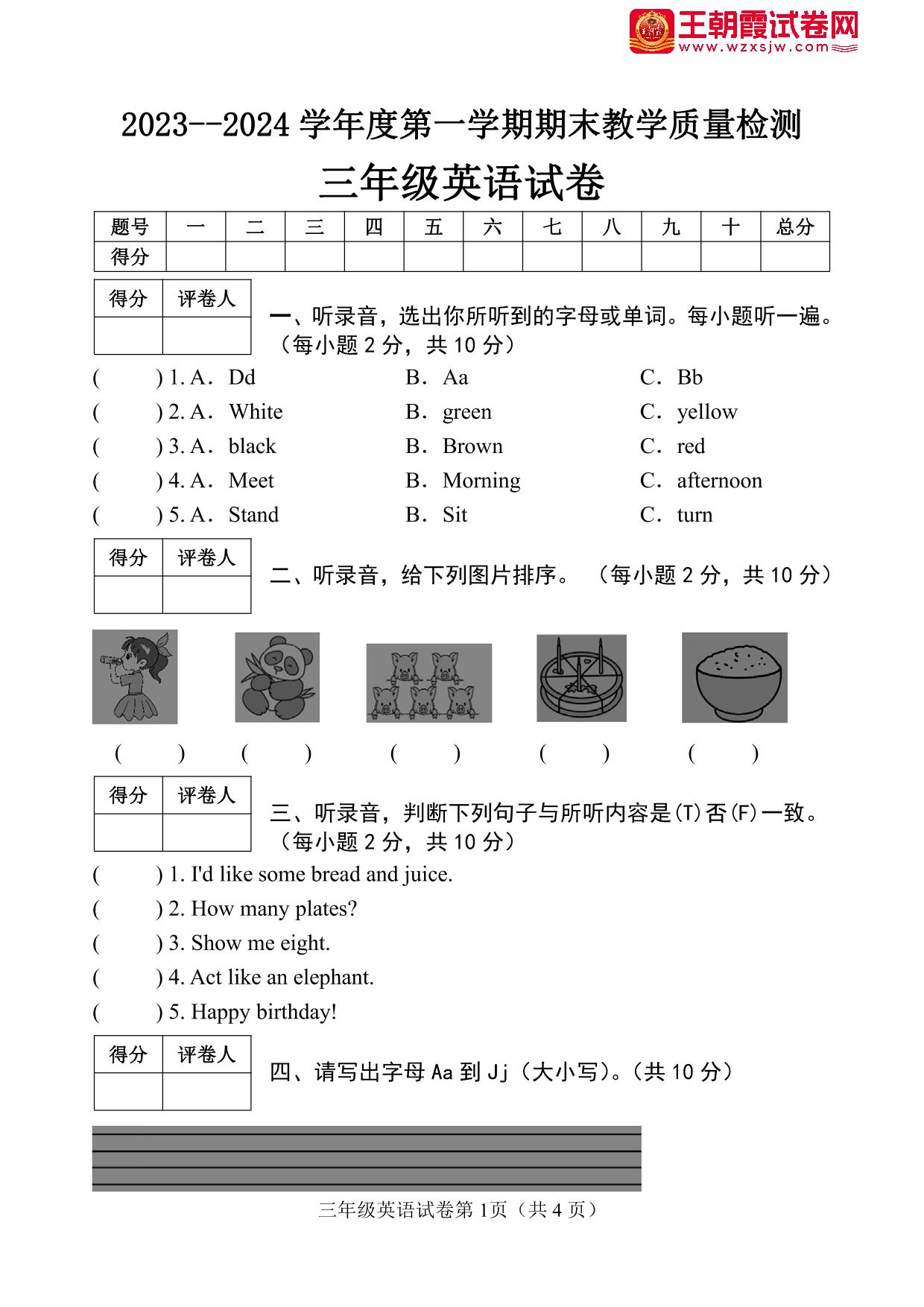 三年级英语人教PEP版(三起始)上册期末卷