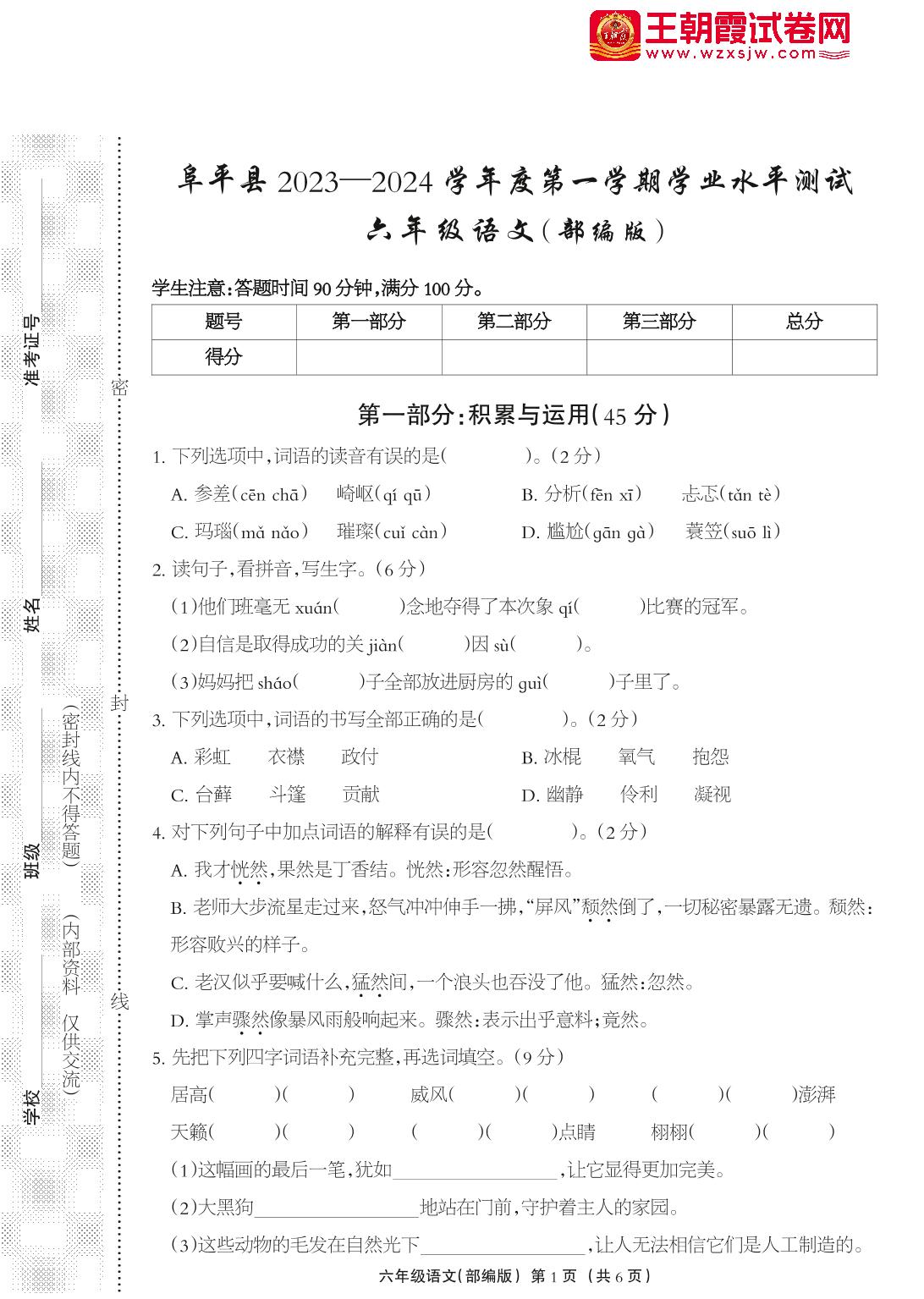 河北省保定市阜平县2023-2024学年度第一学期期末学业水平测试试卷六年级语文(人教版)