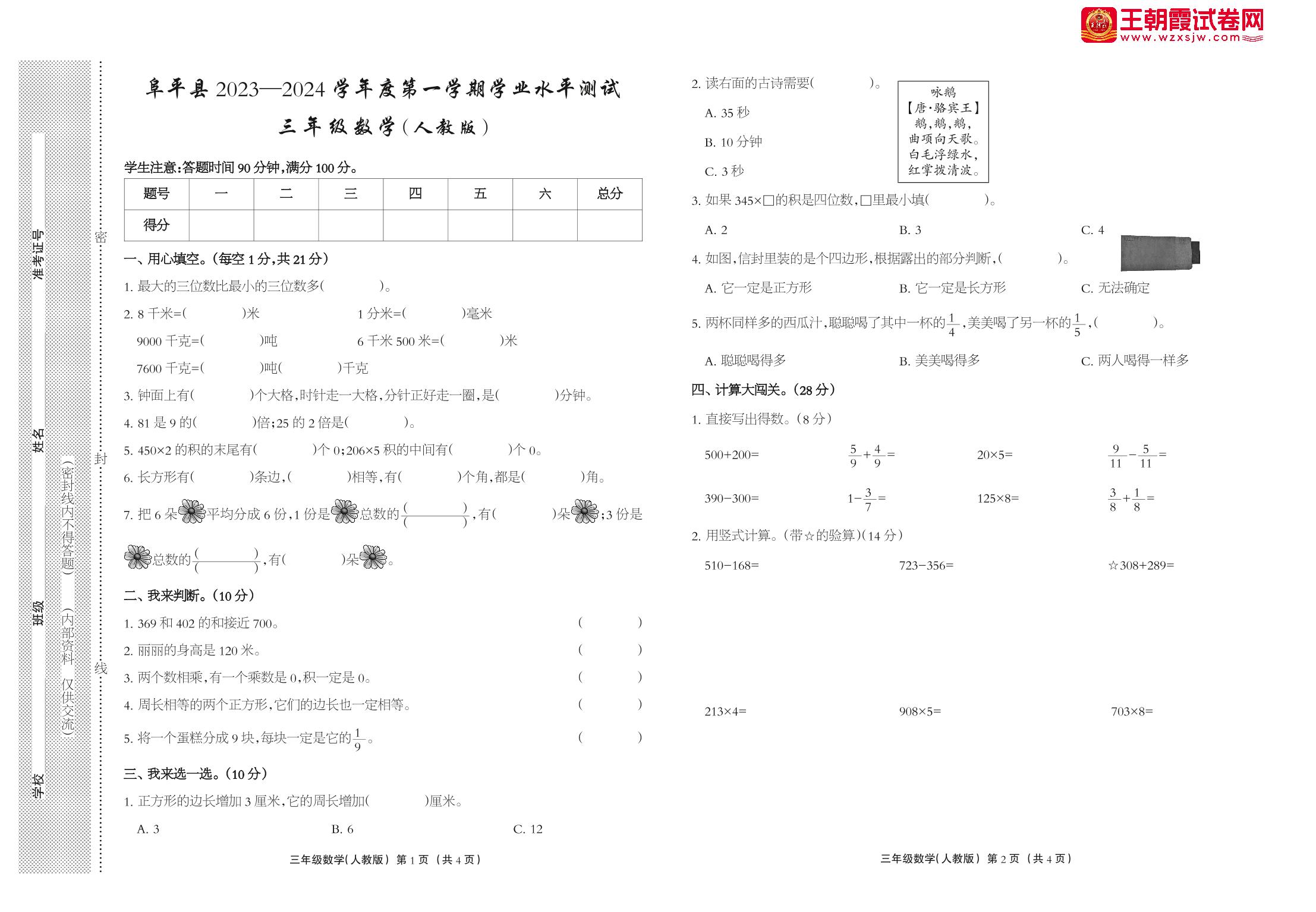 河北省保定市阜平县2023-2024学年度第一学期期末学业水平测试试卷三年级数学(人教版)