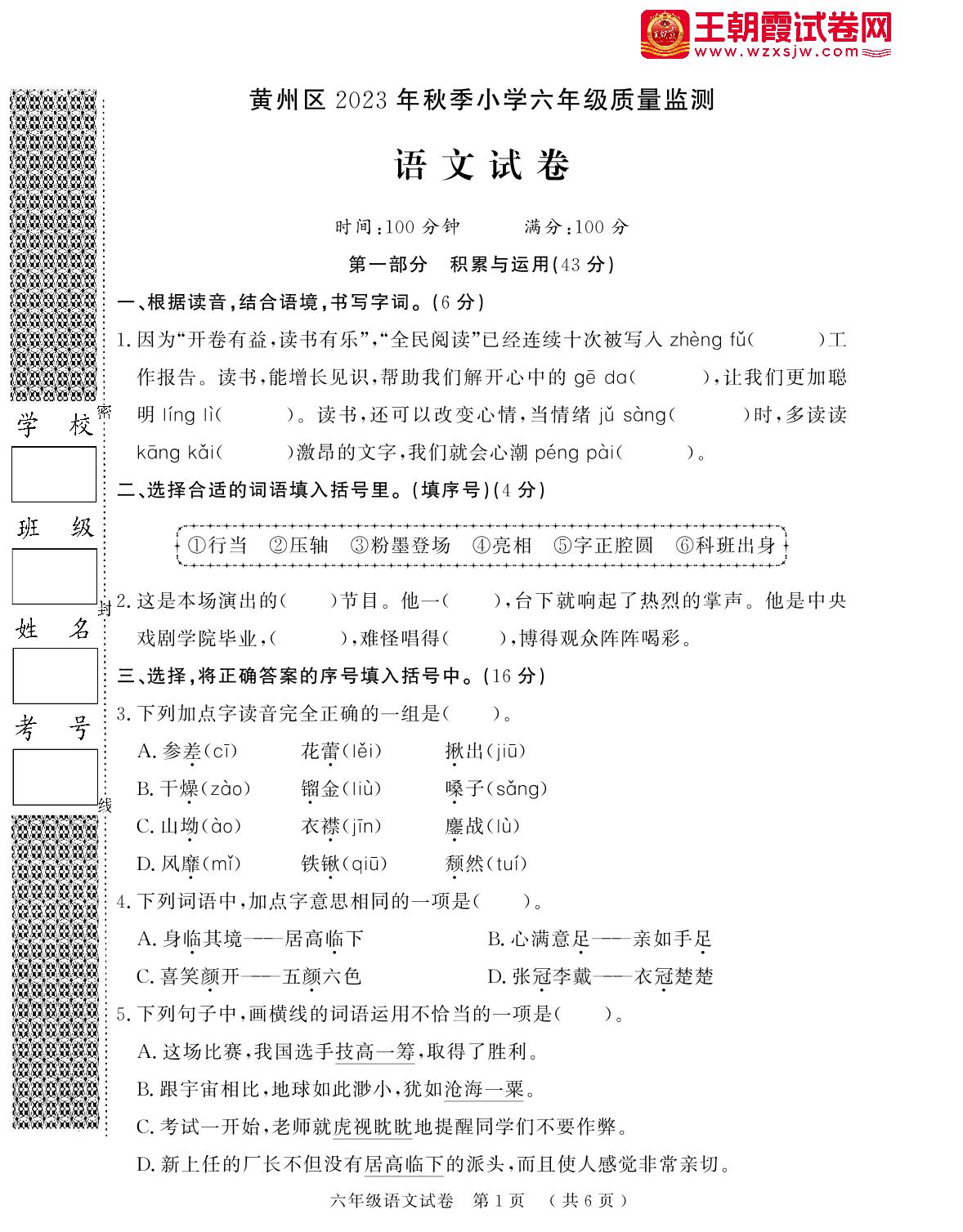 湖北省黄冈市黄州区2023年秋季小学期末质量监测试卷六年级语文(人教版)