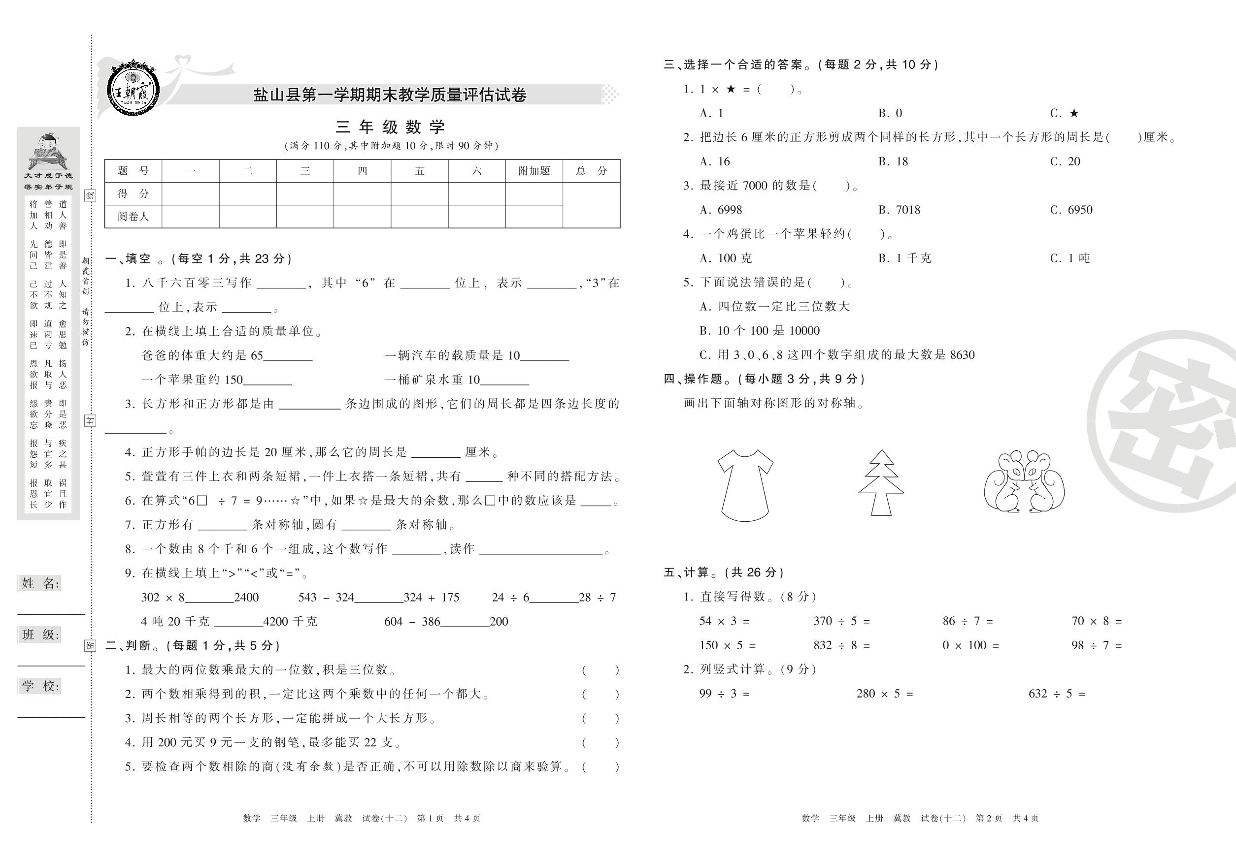2016-2017学年第一学期沧州市盐山县三年级数学试卷(冀教版)【12】