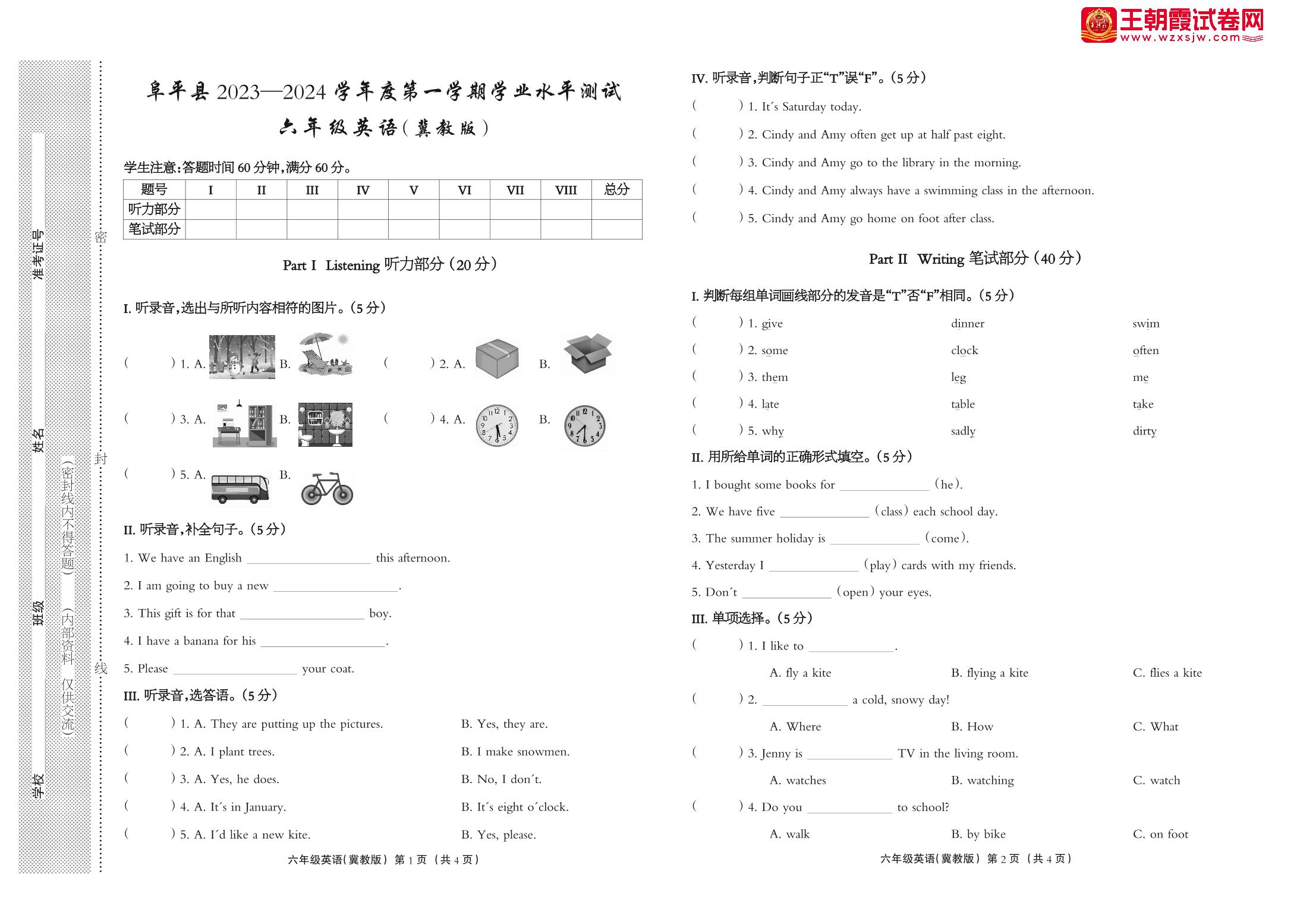 河北省保定市阜平县2023-2024学年度第一学期期末学业水平测试试卷六年级英语(冀教版)