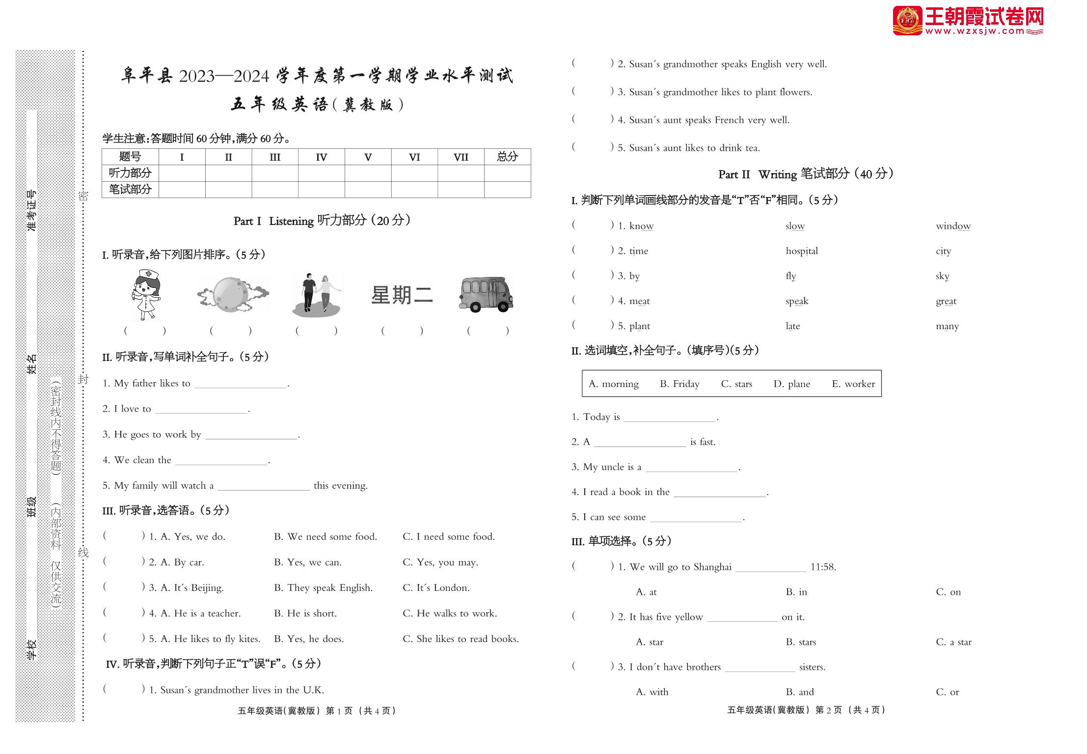 河北省保定市阜平县2023-2024学年度第一学期期末学业水平测试试卷五年级英语(冀教版)【无听力音频】