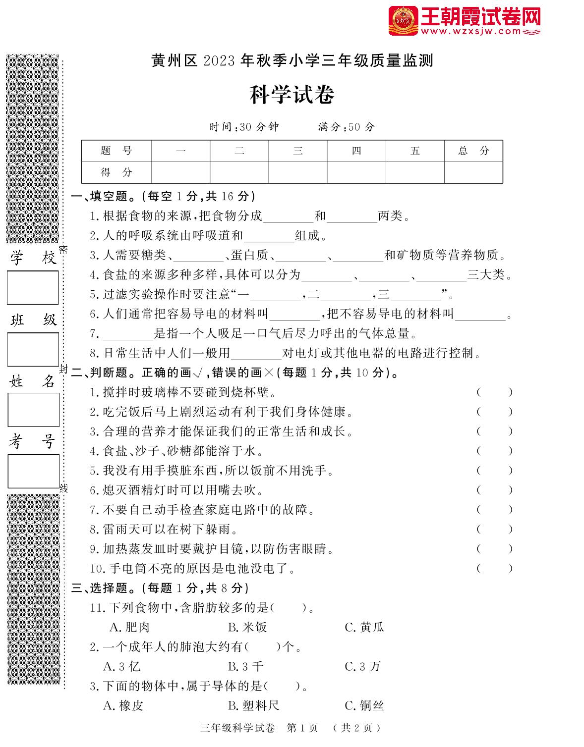 湖北省黄冈市黄州区2023年秋季小学期末质量监测试卷三年级科学(人教鄂教版)