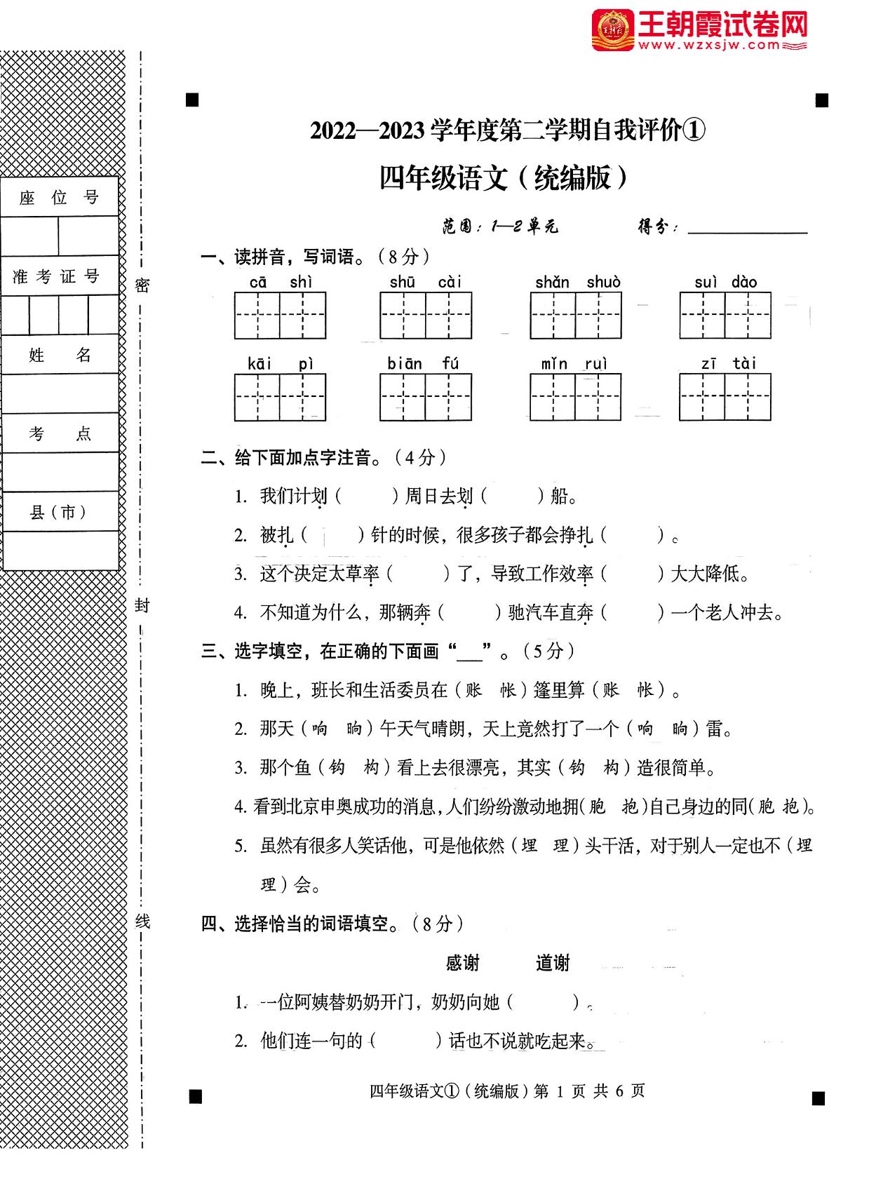 河北省保定市阜平县五校联考2022-2023学年度第二学期自我评价①3月月考四年级语文(人教版)