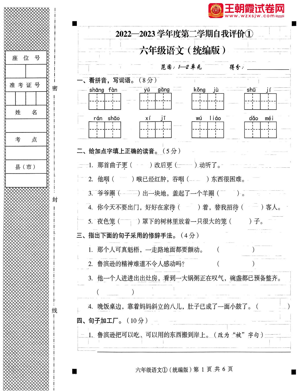 河北省保定市阜平县五校联考2022-2023学年度第二学期自我评价①3月月考六年级语文(人教版)