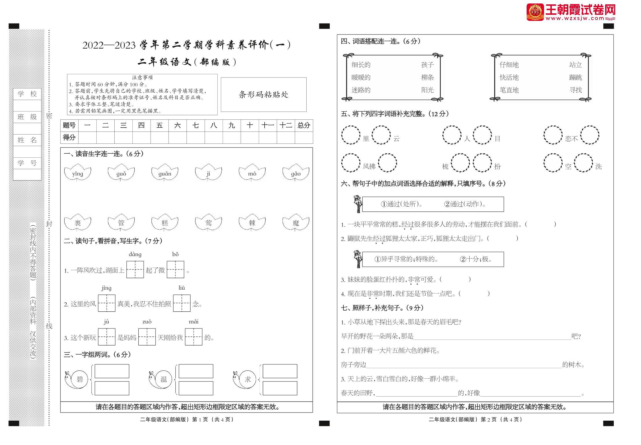 二年级语文人教版下册月考卷