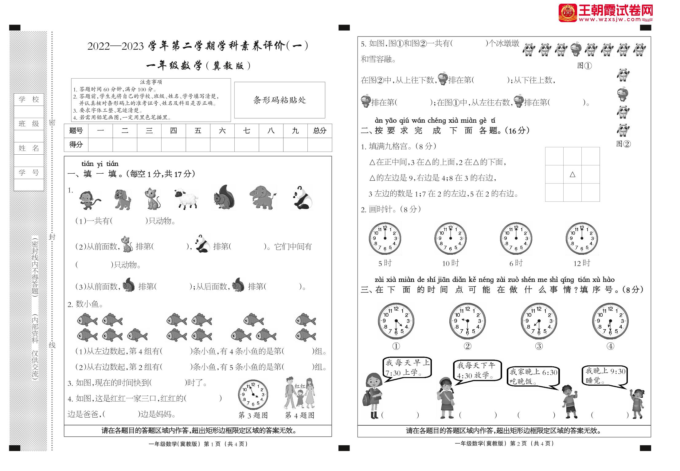 一年级数学冀教版下册月考卷