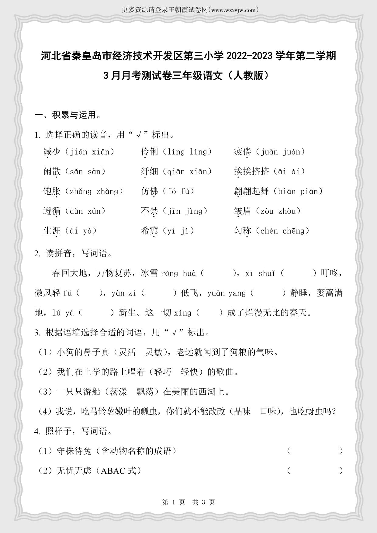 河北省秦皇岛市经济技术开发区第三小学2022-2023学年第二学期3月月考测试卷三年级语文(人教版)