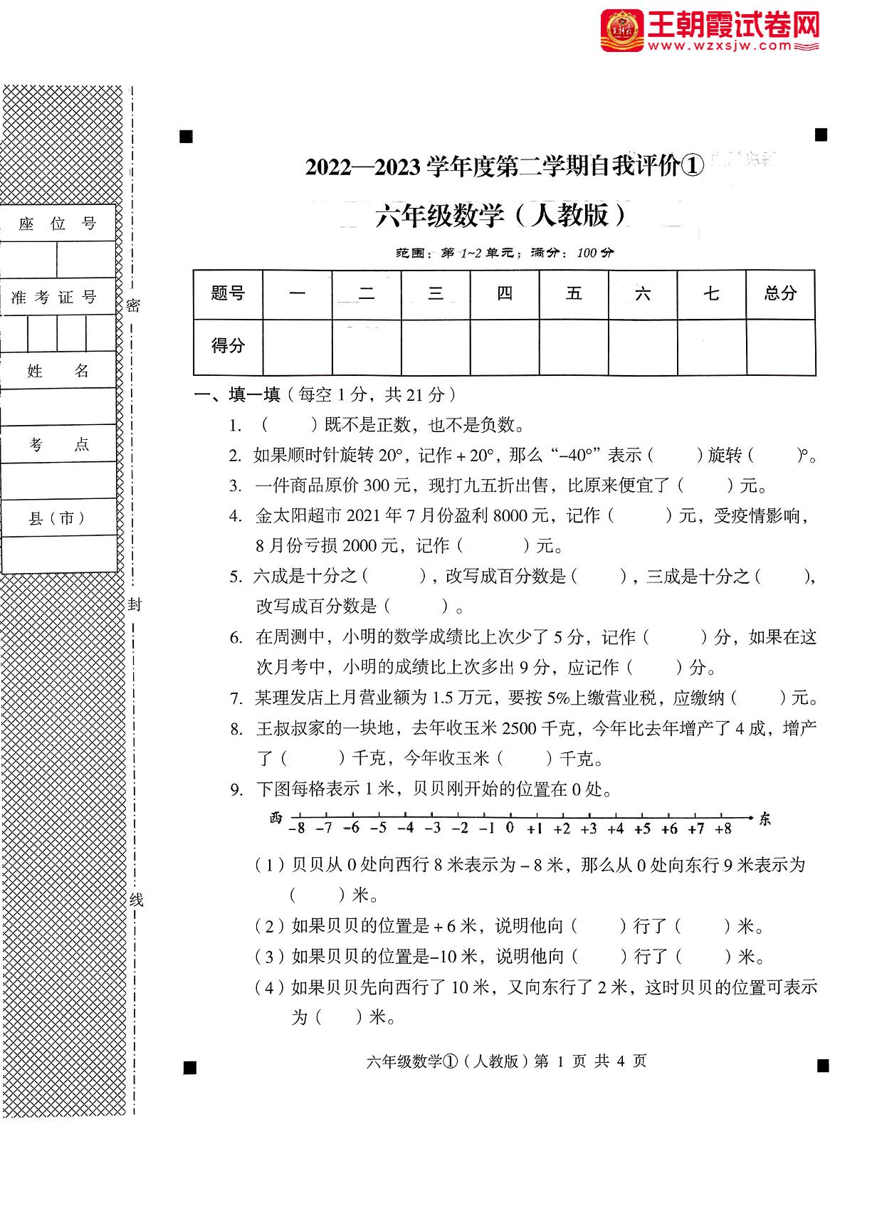 河北省保定市阜平县五校联考2022-2023学年度第二学期自我评价①3月月考六年级数学(人教版)