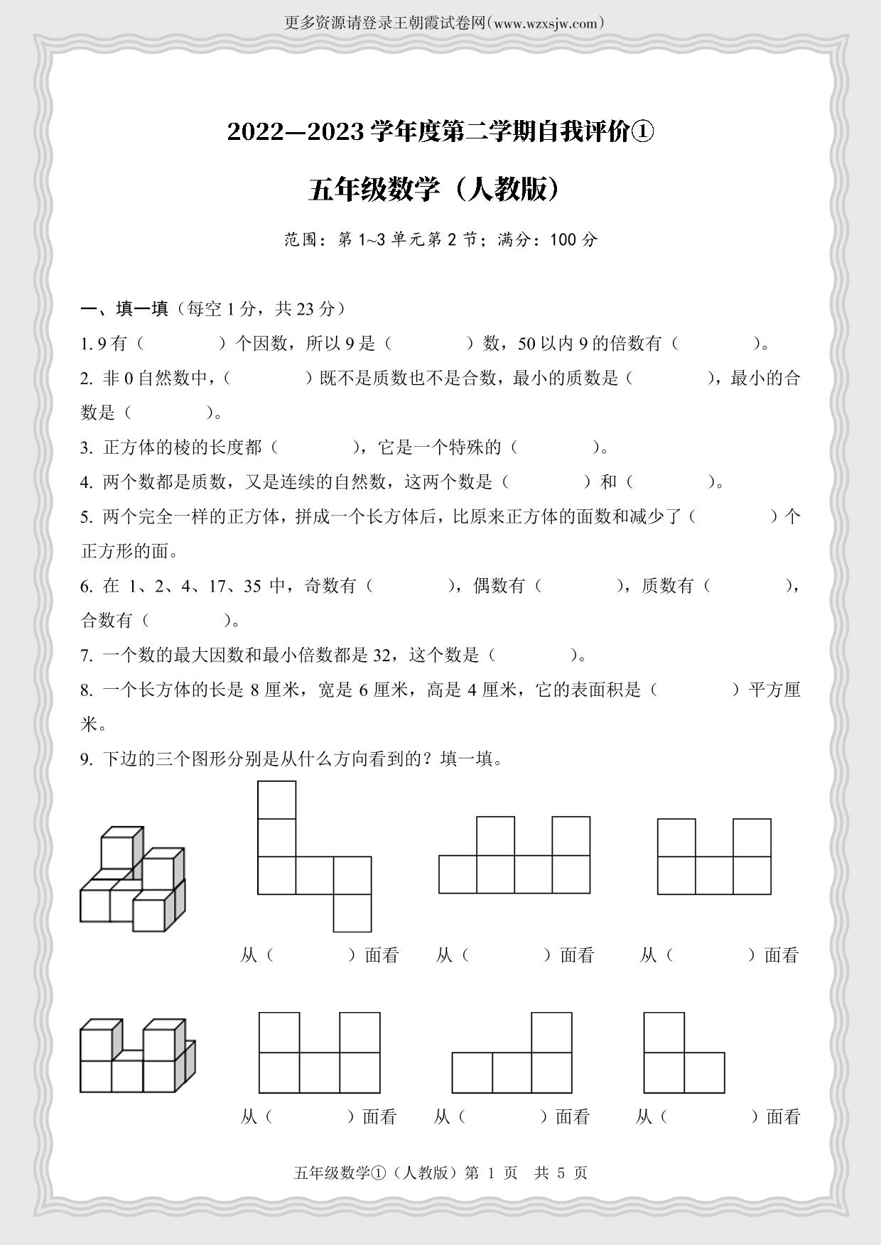 河北省保定市阜平县五校联考2022-2023学年度第二学期自我评价①3月月考五年级数学(人教版)