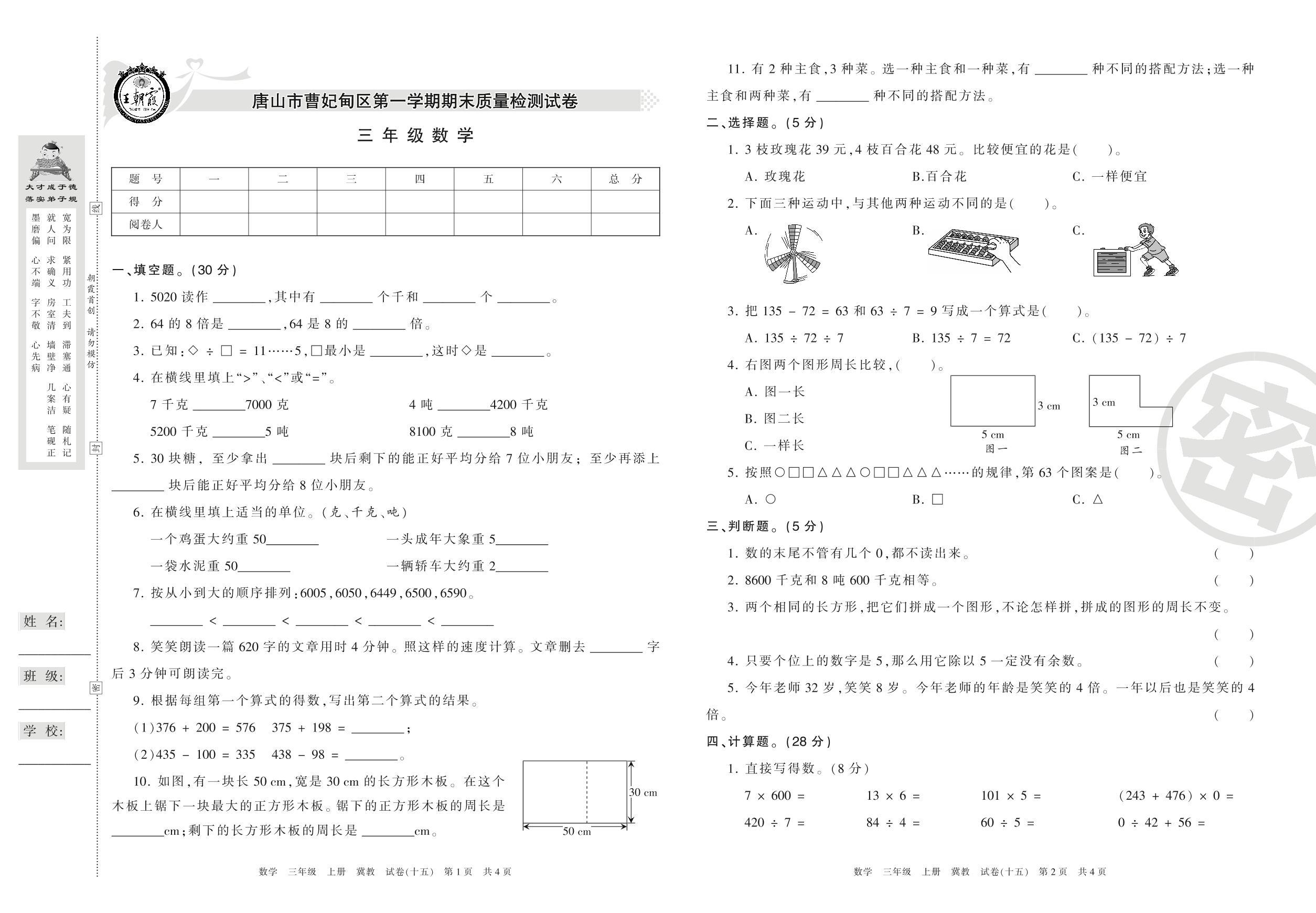 2016-2017学年第一学期唐山市曹妃甸区三年级数学试卷(冀教版)【15】