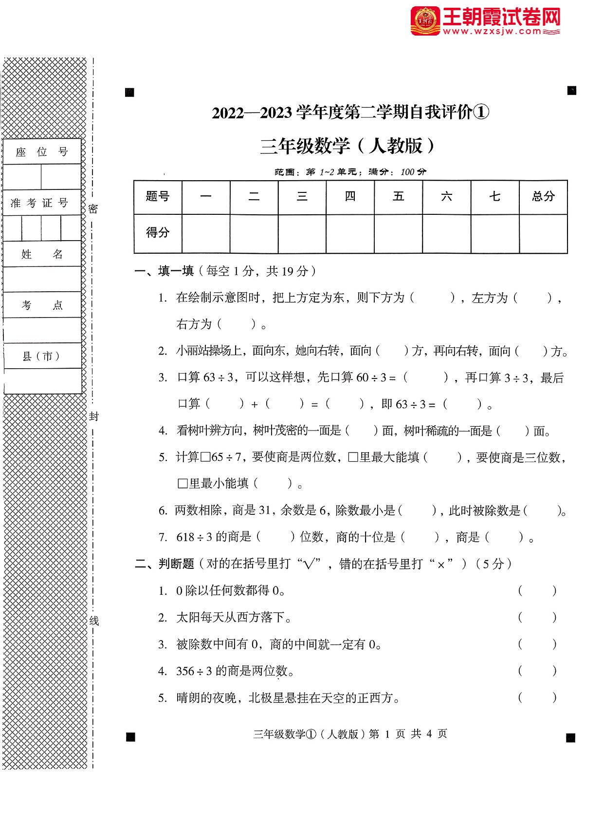 河北省保定市阜平县五校联考2022-2023学年度第二学期自我评价①3月月考三年级数学(人教版)