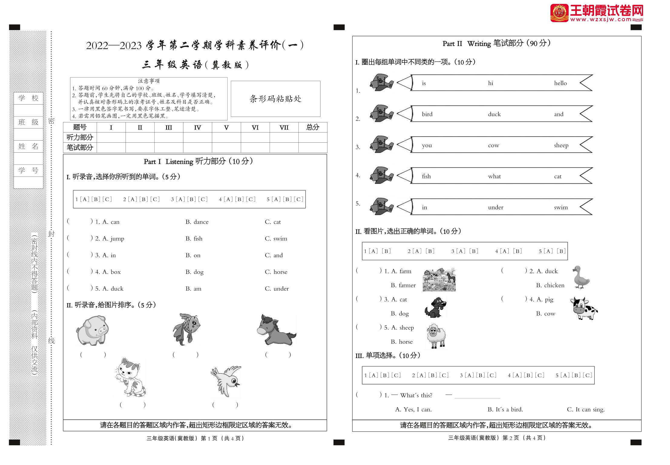 河北省邢台市南宫市2022-2023学年第二学期学科素养评价(一)3月月考三年级英语(冀教版)【无听力音频】