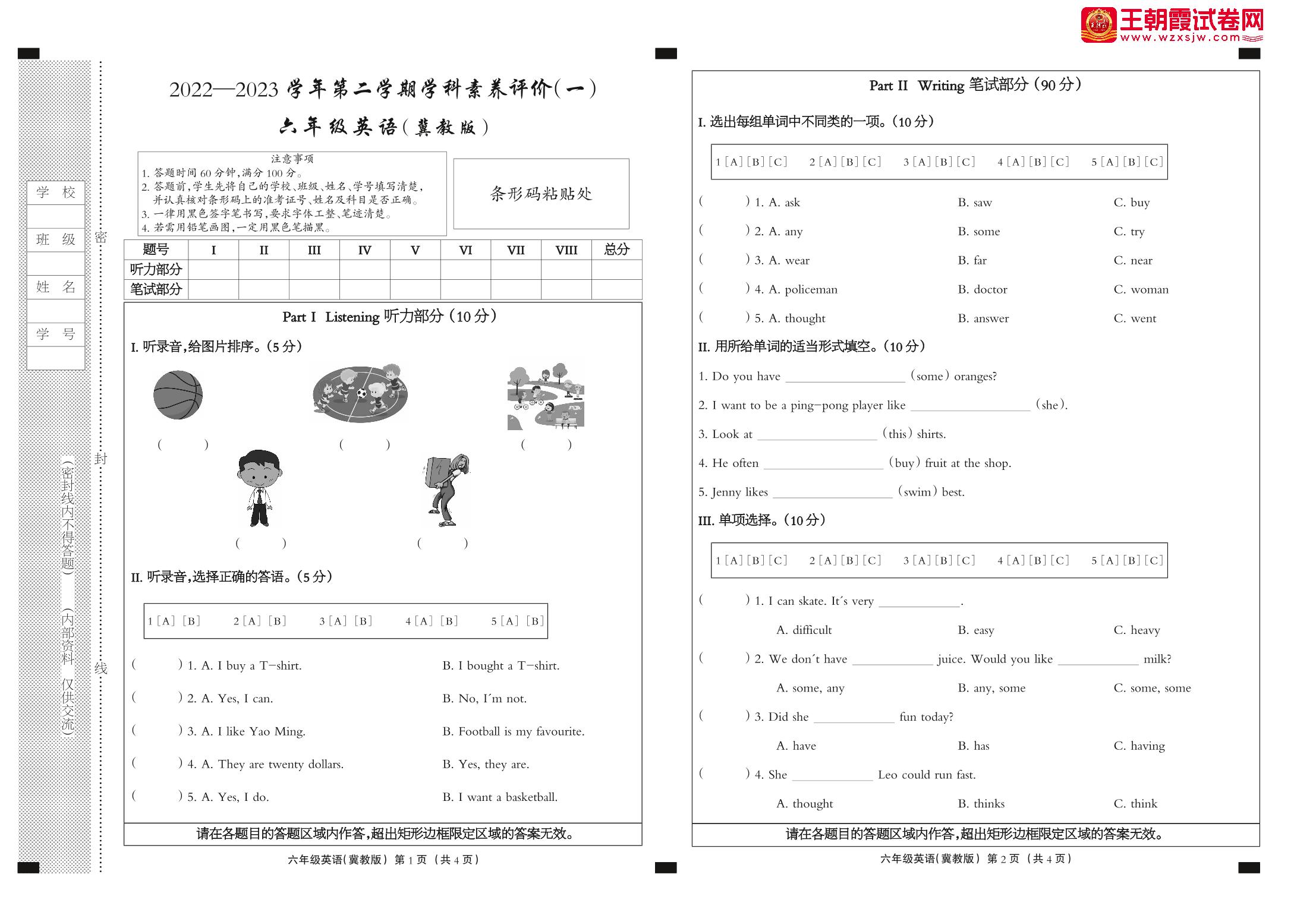 河北省邢台市南宫市2022-2023学年第二学期学科素养评价(一)3月月考六年级英语(冀教版)【无听力音频】