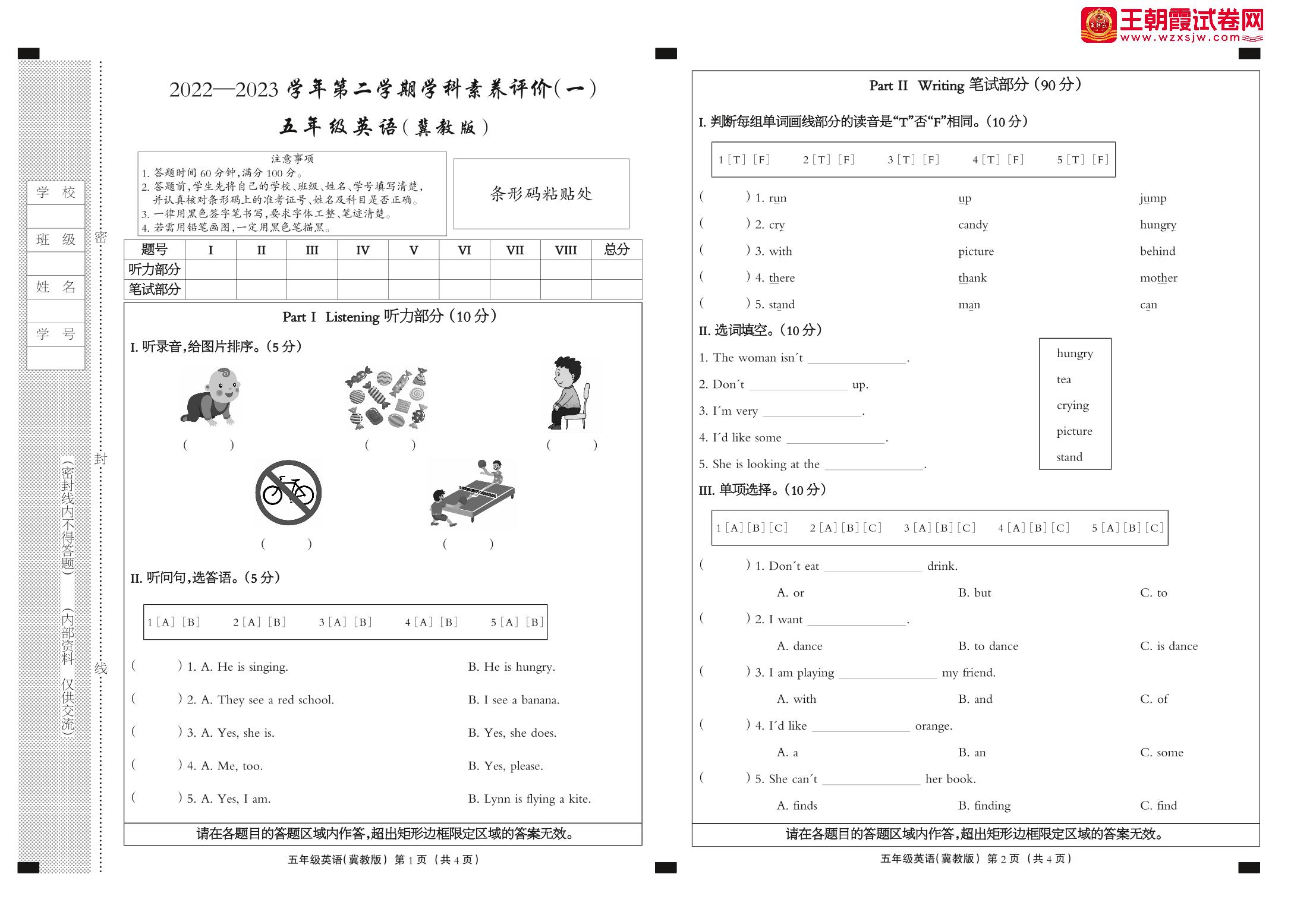 河北省邢台市南宫市2022-2023学年第二学期学科素养评价(一)3月月考五年级英语(冀教版)【无听力音频】