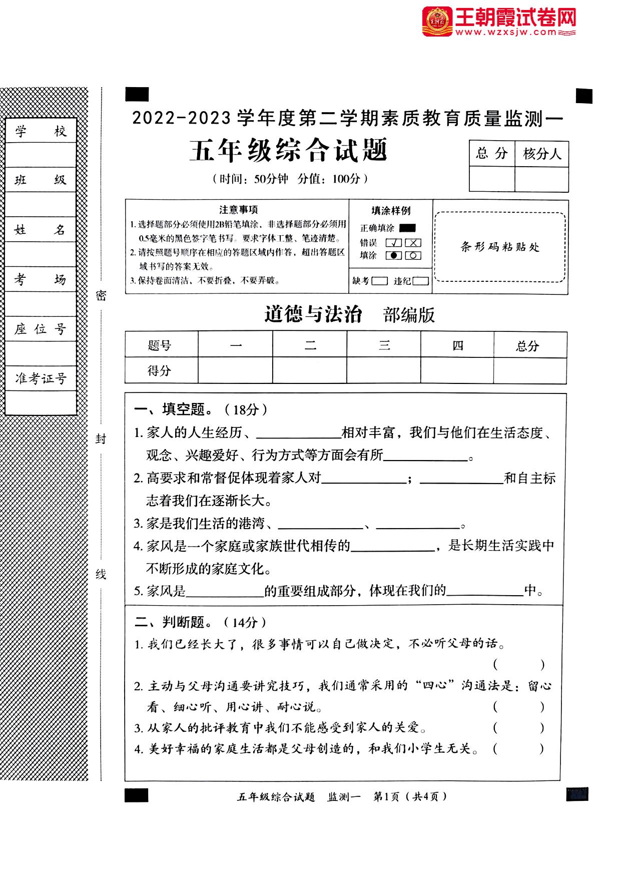河北省邢台市2022-2023学年度第二学期素质教育质量监测一3月月考五年级道德与法治(人教版)