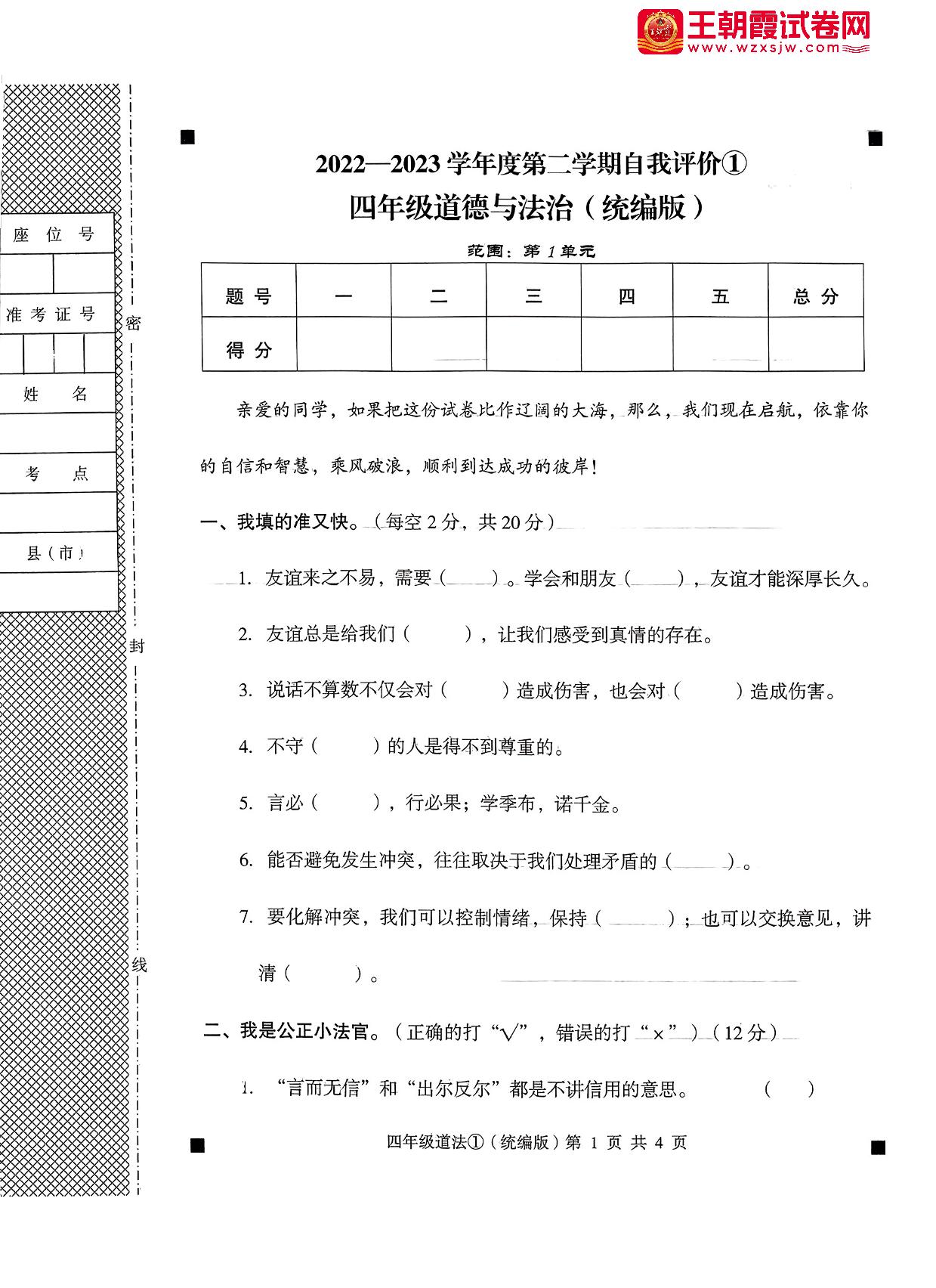 河北省保定市阜平县五校联考2022-2023学年度第二学期自我评价①3月月考四年级道德与法治(人教版)