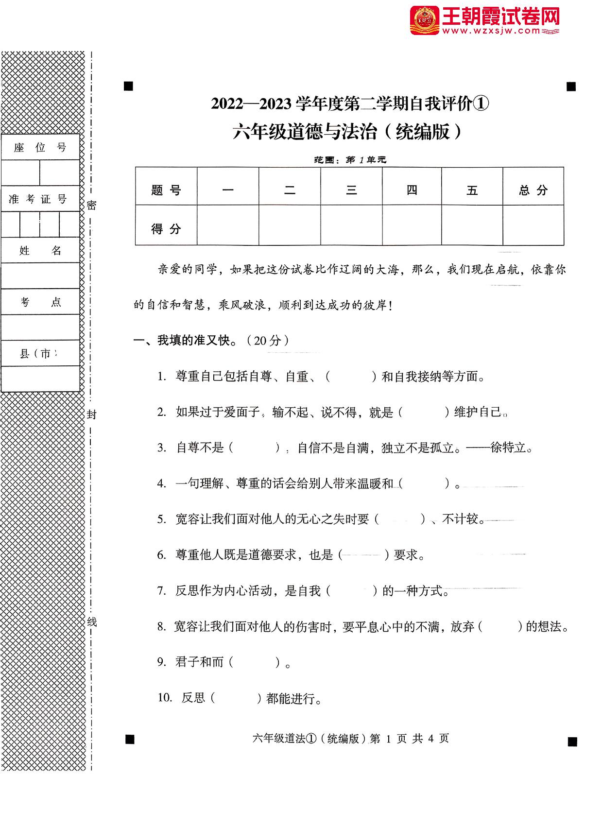 河北省保定市阜平县五校联考2022-2023学年度第二学期自我评价①3月月考六年级道德与法治(人教版)