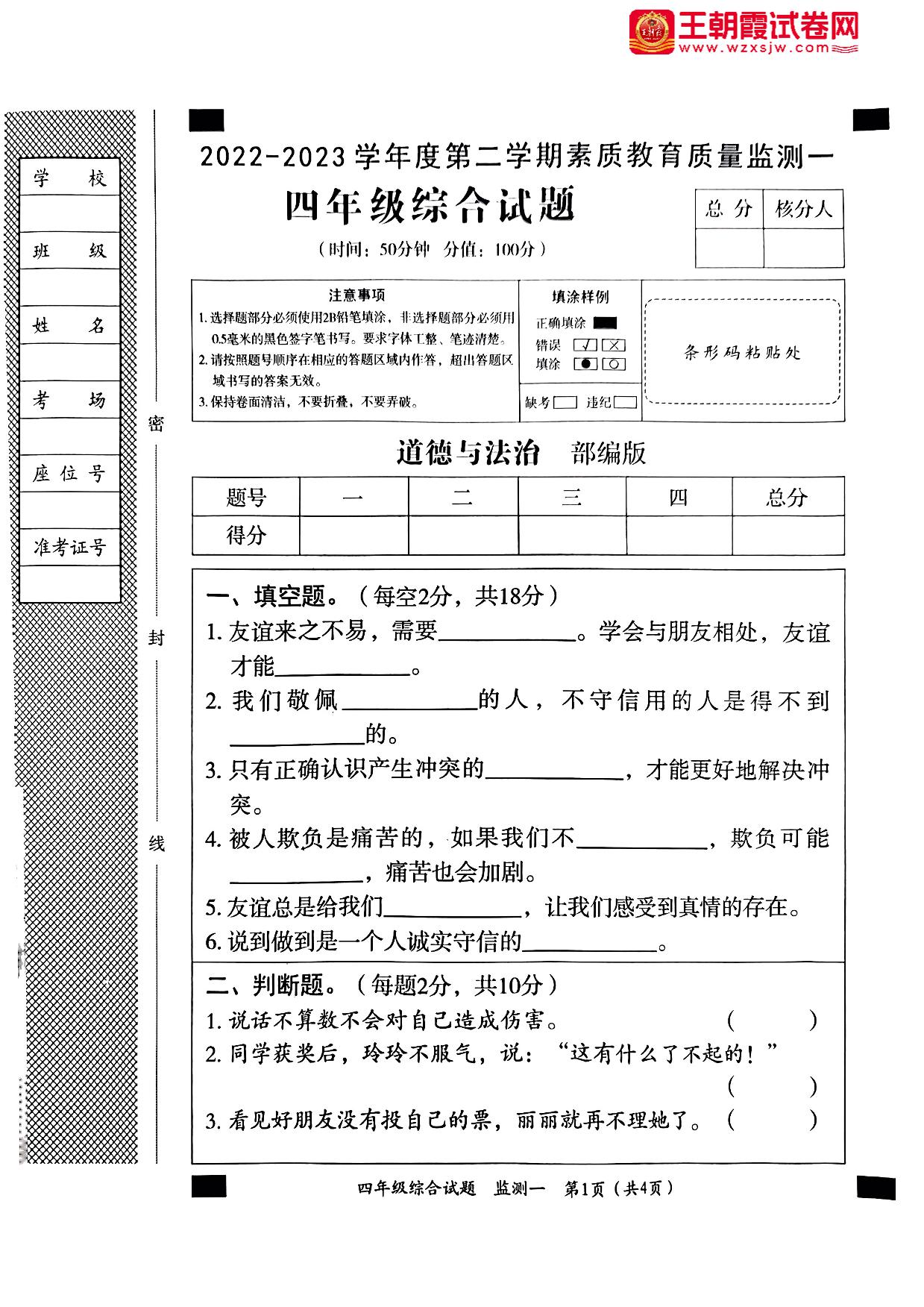 河北省邢台市2022-2023学年度第二学期素质教育质量监测一3月月考四年级道德与法治(人教版)
