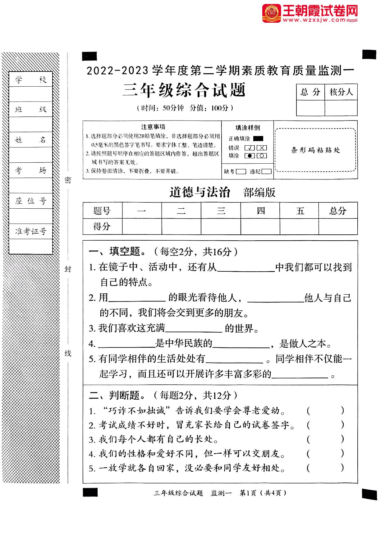 河北省邢台市2022-2023学年度第二学期素质教育质量监测一3月月考三年级道德与法治(人教版)