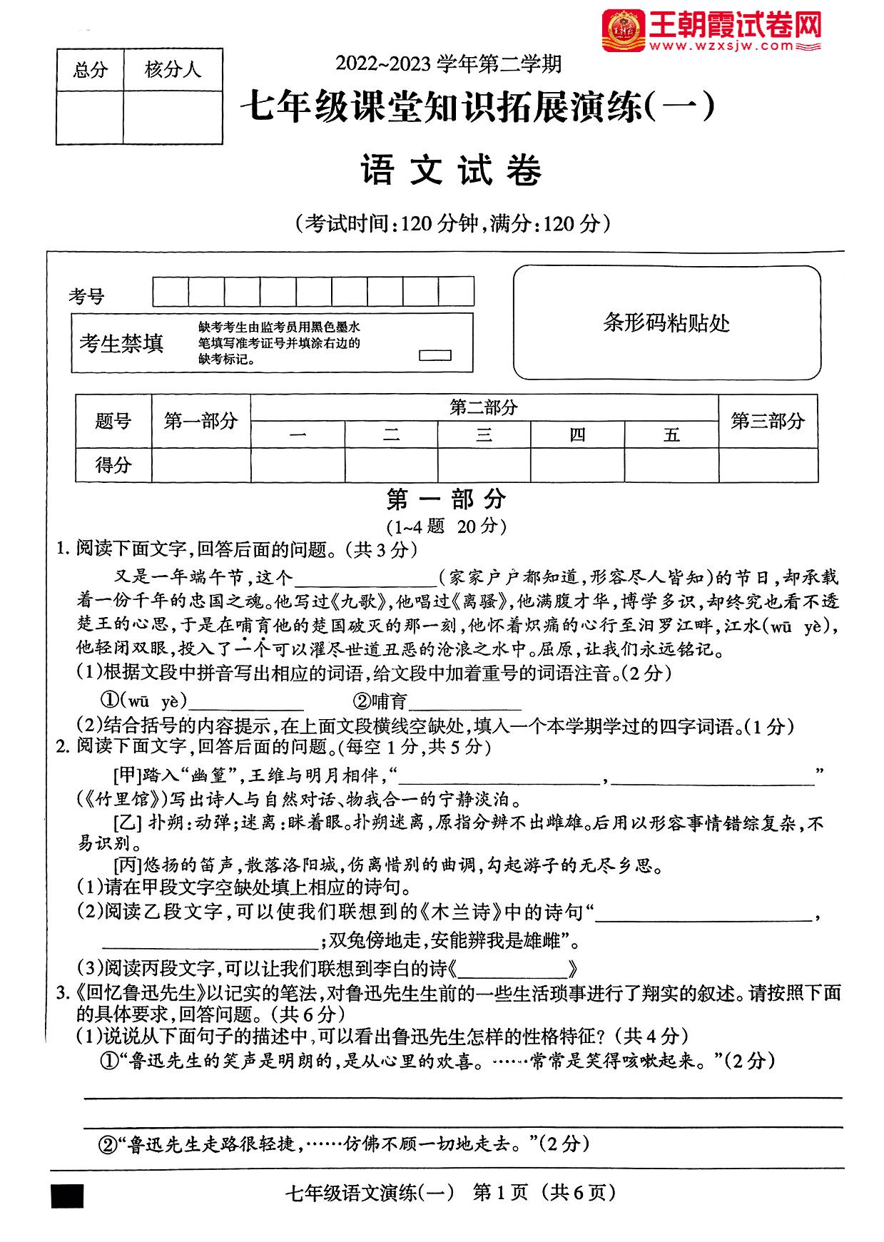 河北省沧州市献县万村中学2022-2023学年第二学期课堂知识拓展演练(一)3月月考七年级语文(人教版)