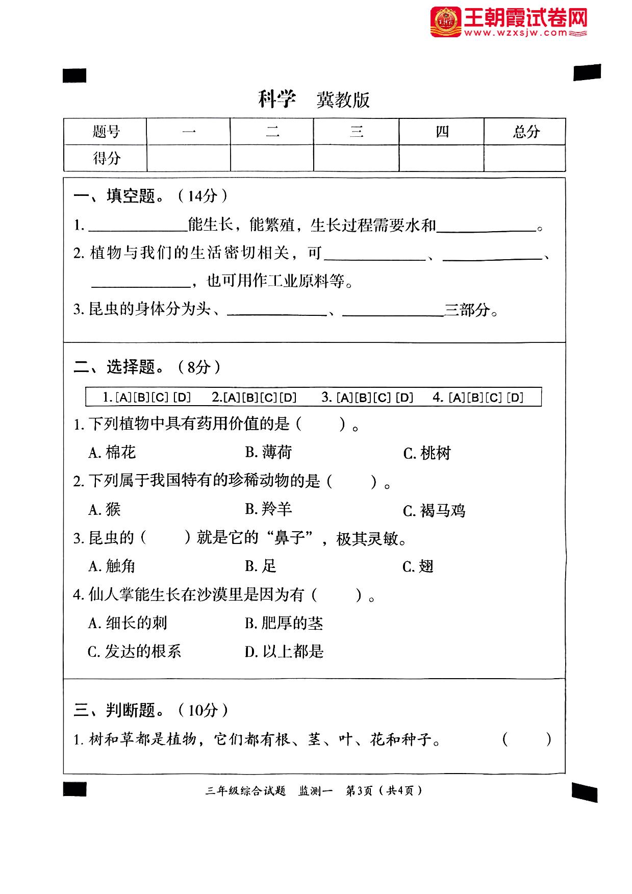 河北省邢台市2022-2023学年度第二学期素质教育质量监测一3月月考三年级科学(冀教版)