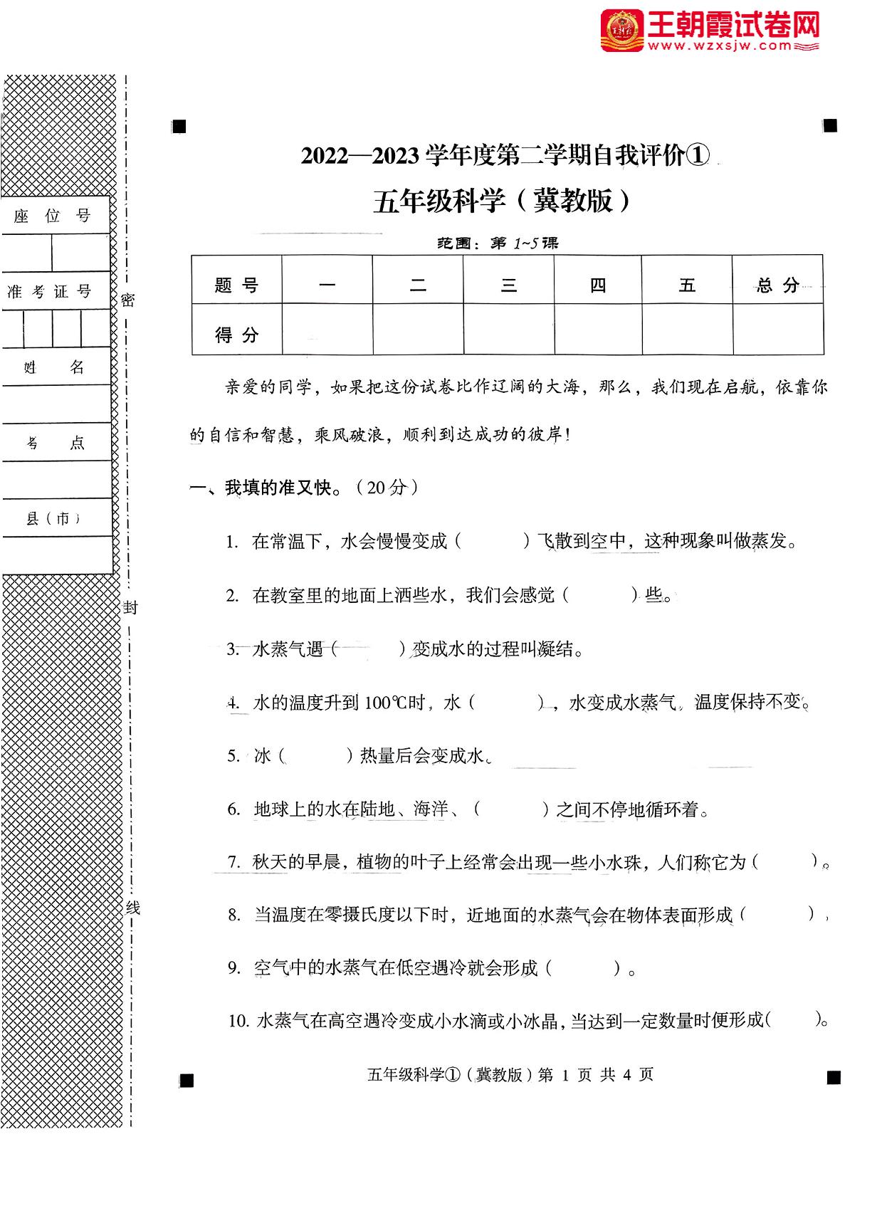 河北省保定市阜平县五校联考2022-2023学年度第二学期自我评价①3月月考五年级科学(冀教版)