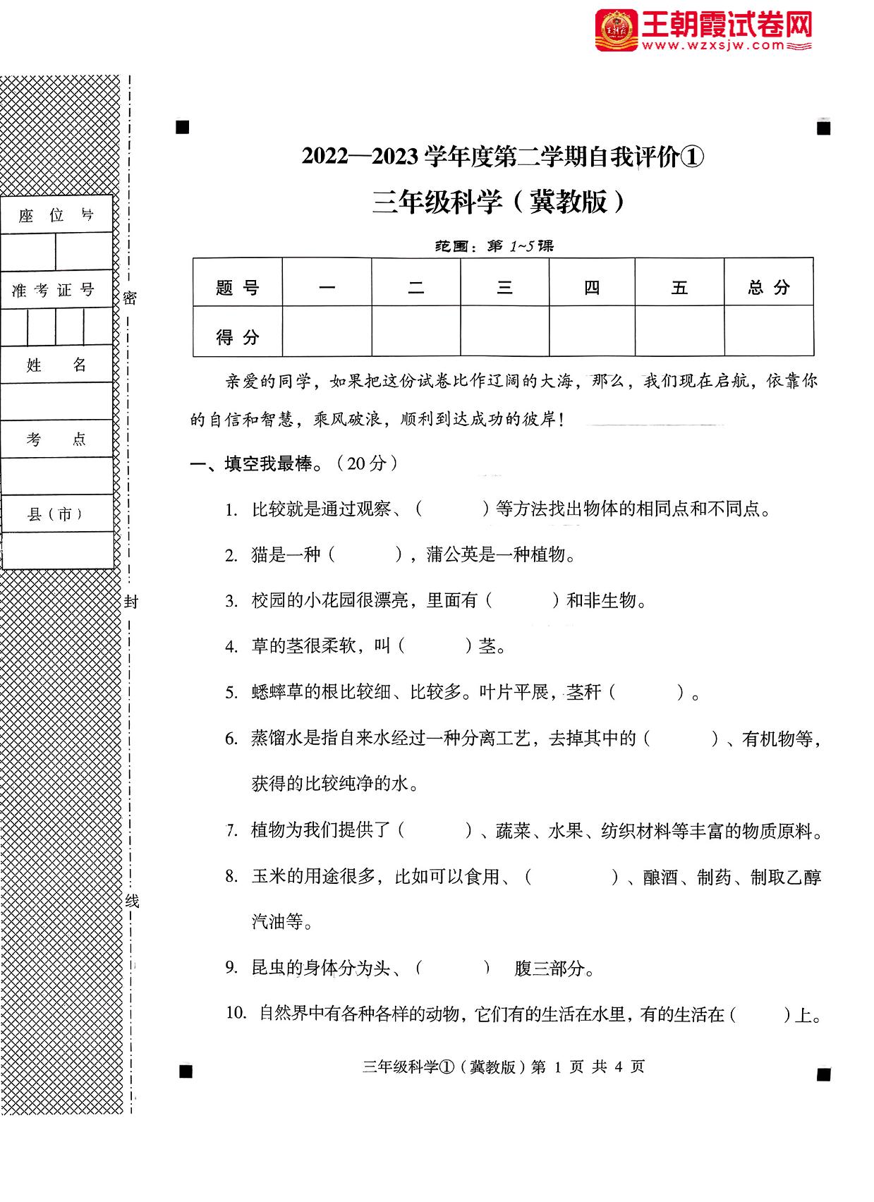 河北省保定市阜平县五校联考2022-2023学年度第二学期自我评价①3月月考三年级科学(冀教版)