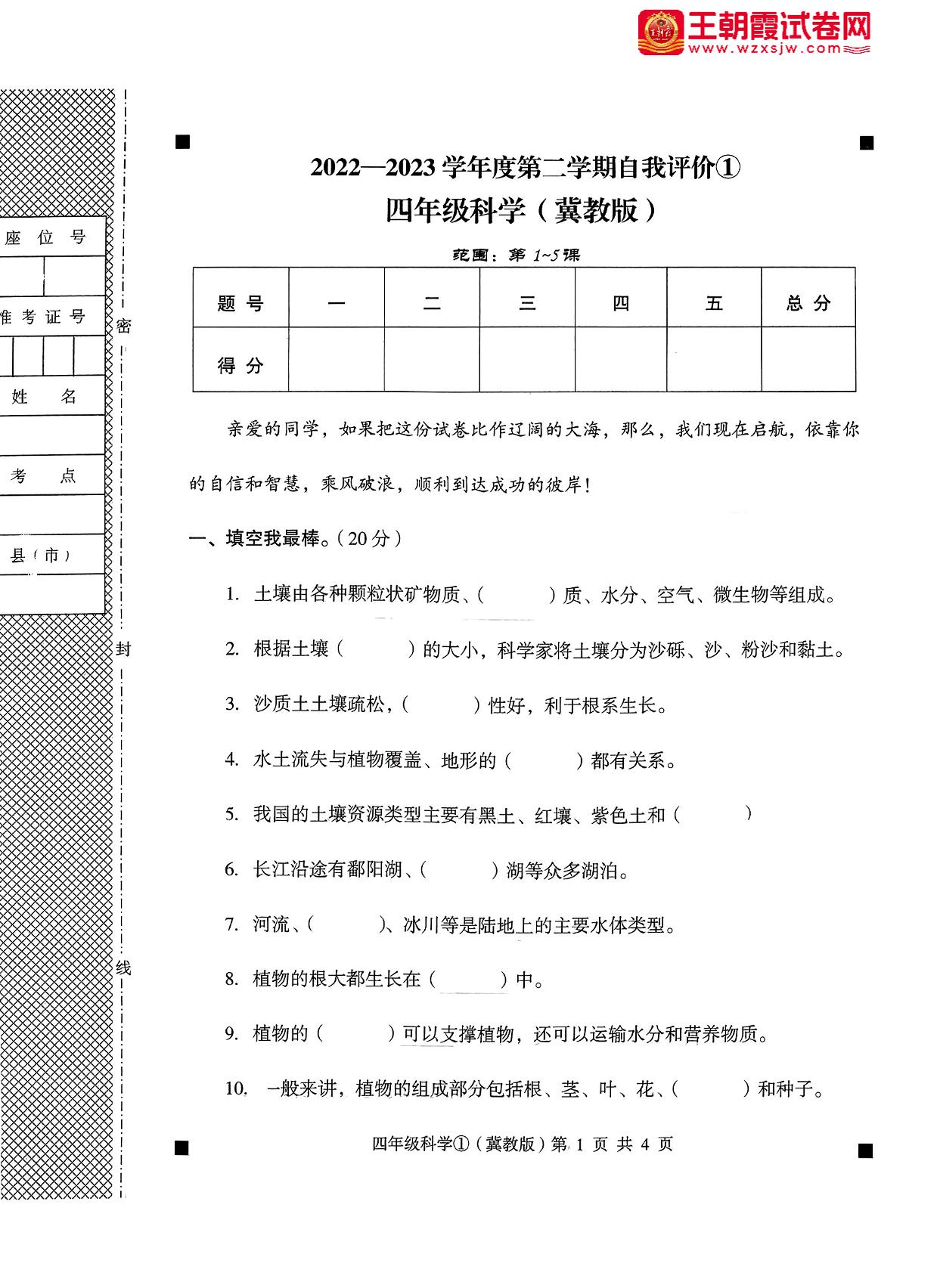 河北省保定市阜平县五校联考2022-2023学年度第二学期自我评价①3月月考四年级科学(冀教版)