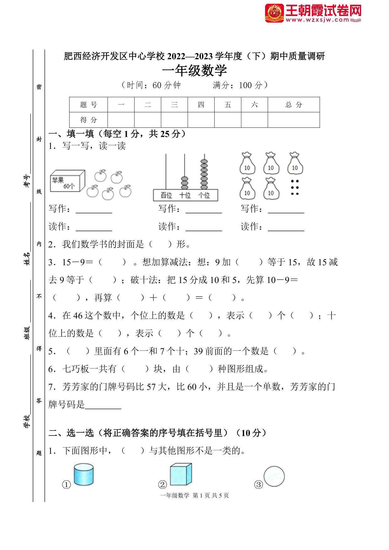 安徽省合肥市肥西县经济开发区中心学校2022-2023学年度下学期期中质量调研一年级数学(人教版)