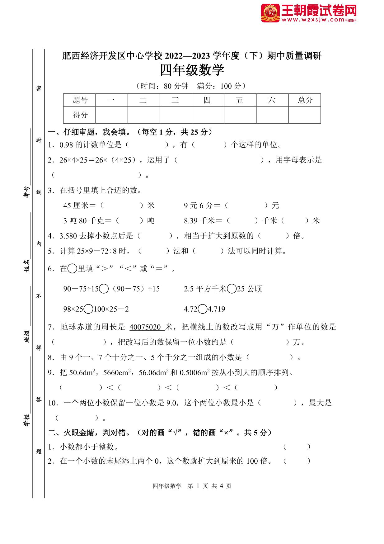安徽省合肥市肥西县经济开发区中心学校2022-2023学年度下学期期中质量调研四年级数学(人教版)