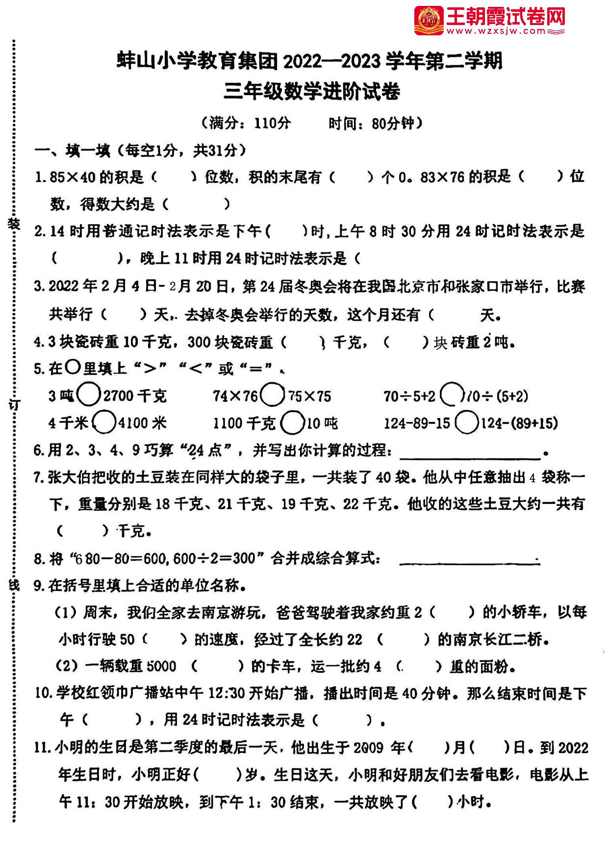 安徽省蚌埠市蚌山区蚌山小学2022-2023学年第二学期期中考试三年级数学(苏教版)