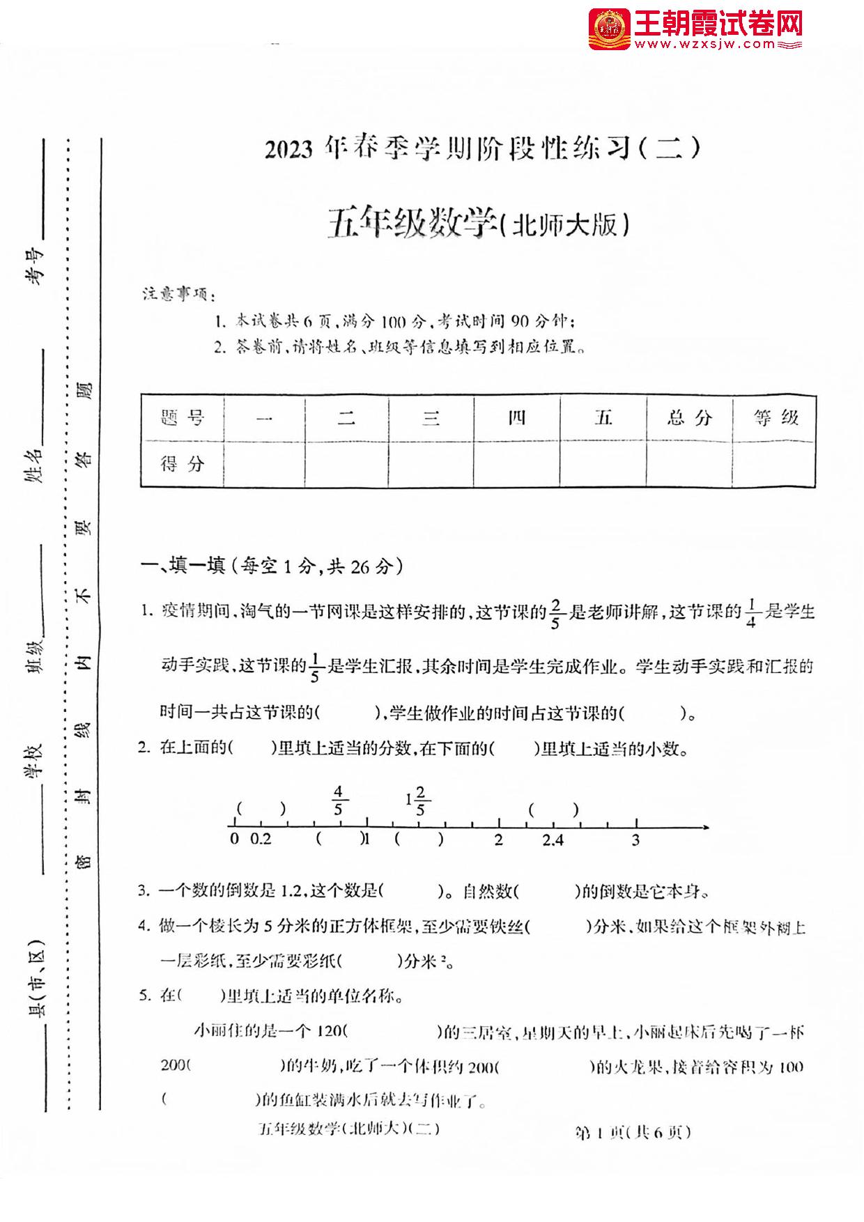 安徽省亳州市谯城区亳州学院附属学校2022-2023学年下学期期中阶段性练习五年级数学(北师版)