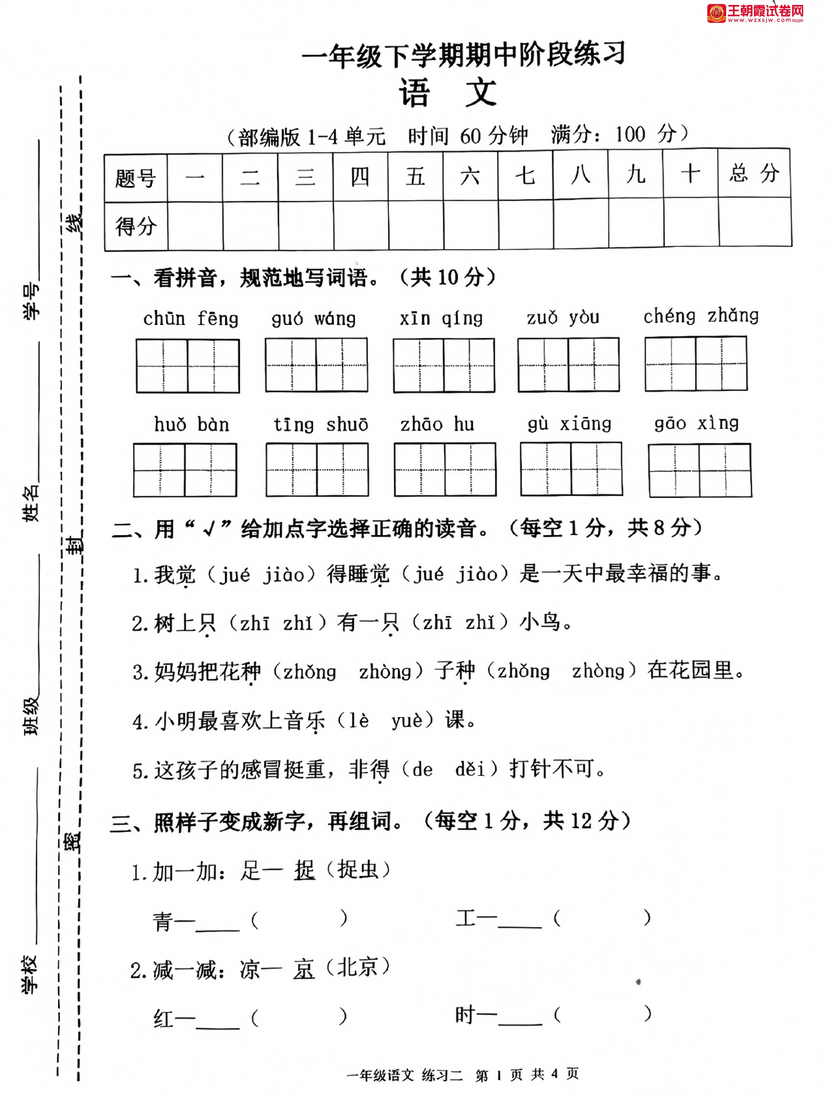 安徽省阜阳市颍州、颍东、颍泉三区2022-2023学年下学期期中阶段练习一年级语文(人教版)