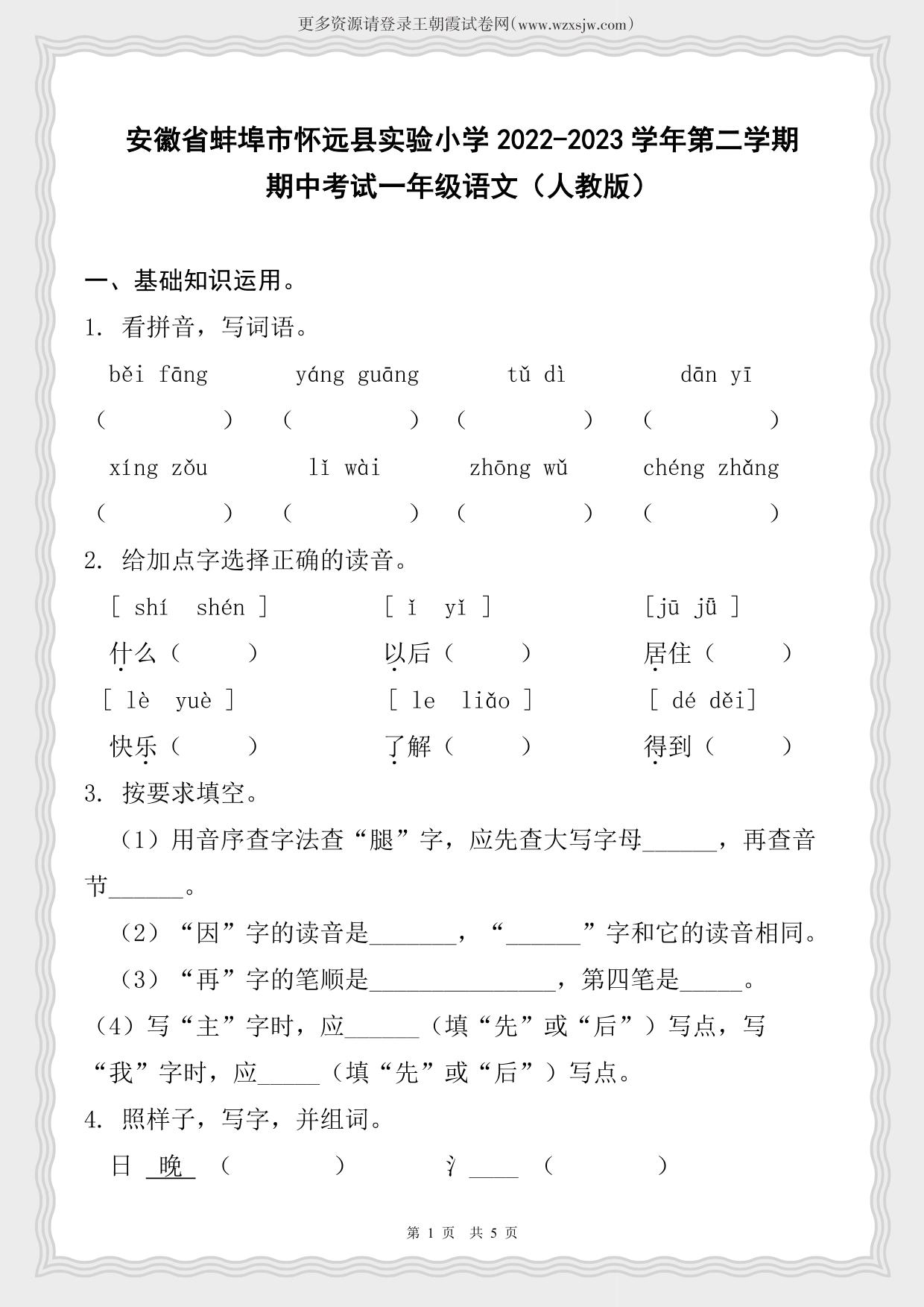 安徽省蚌埠市怀远县实验小学2022-2023学年第二学期期中考试一年级语文(人教版)