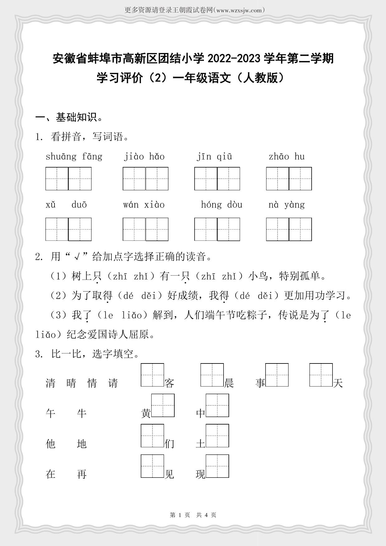 安徽省蚌埠市高新区团结小学2022-2023学年第二学期期中学习评价一年级语文(人教版)