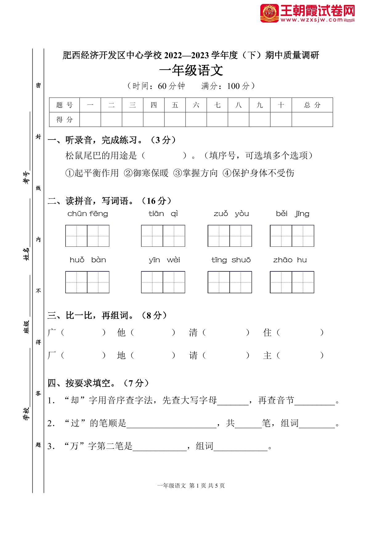 安徽省合肥市肥西县经济开发区中心学校2022-2023学年度下学期期中质量调研一年级语文(人教版)