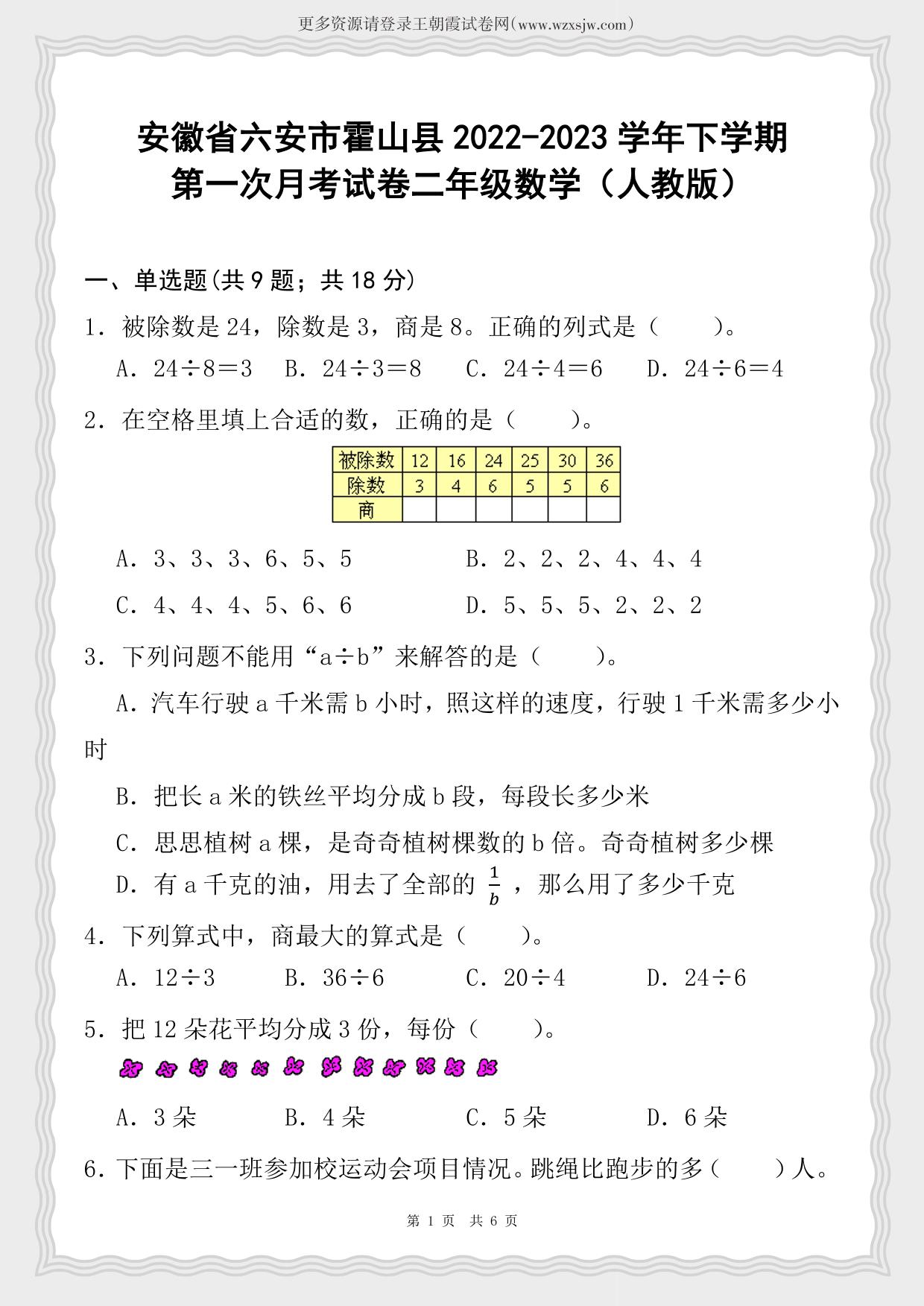 安徽省六安市霍山县2022-2023学年下学期第一次月考试卷二年级数学(人教版)