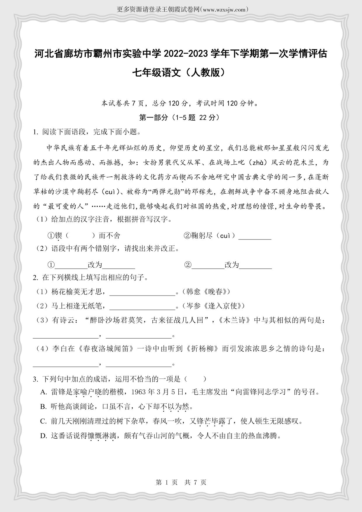 河北省廊坊市霸州市实验中学2022-2023学年下学期第一次学情评估月考试卷七年级语文(人教版)