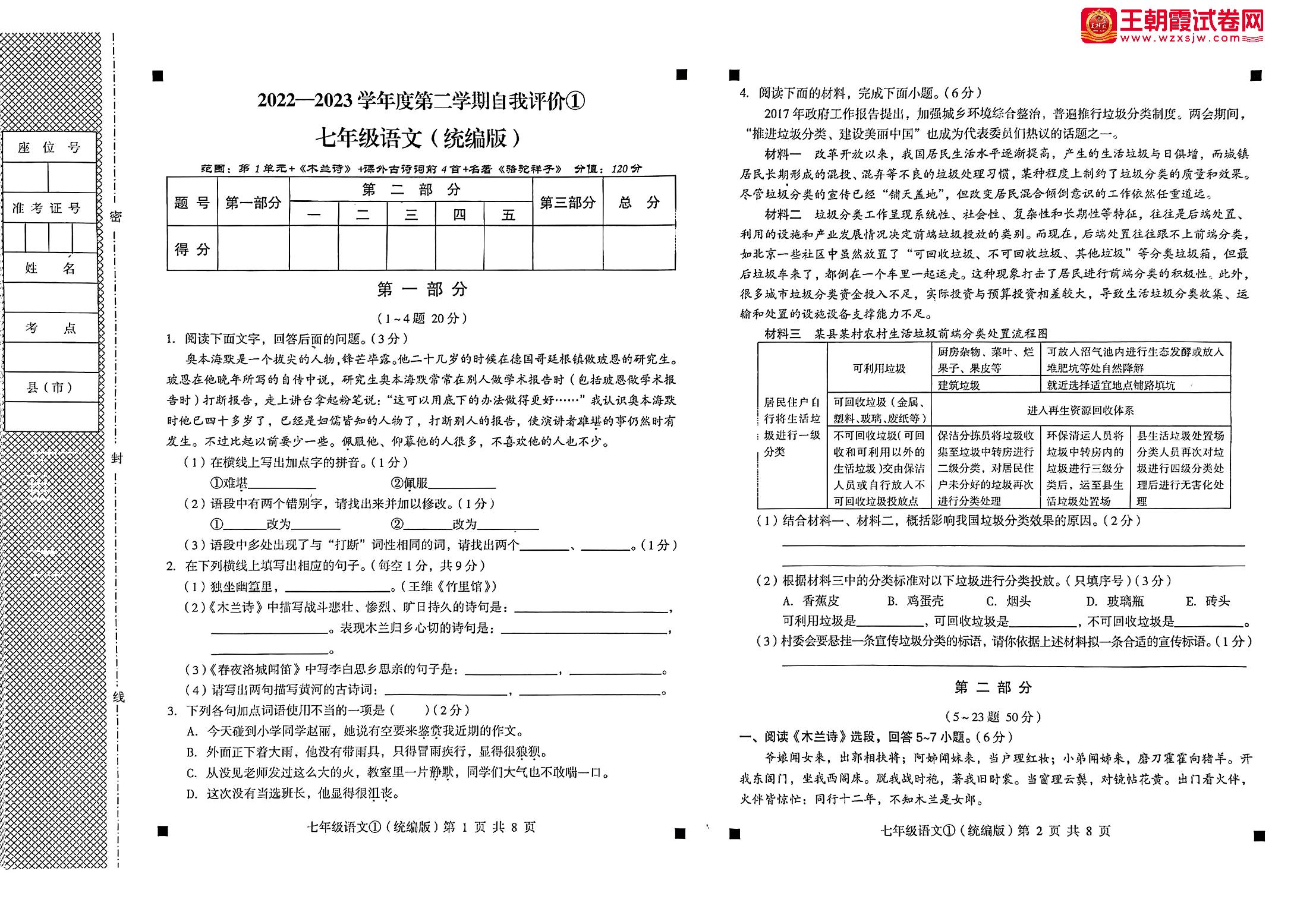 七年级语文人教版下册月考卷