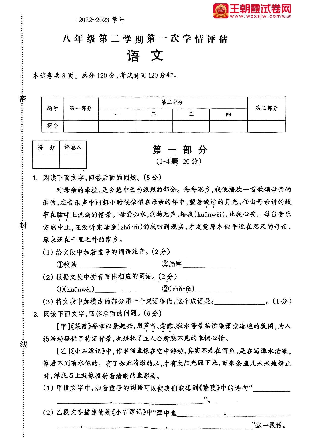 河北省邢台市威县第三中学2022-2023学年第二学期第一次学情评估3月月考八年级语文(人教版)