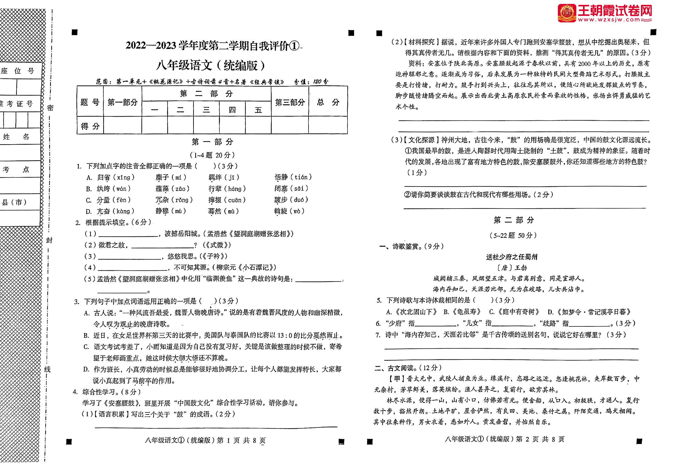 河北省邯郸市峰峰矿区固义中学2022-2023学年度第二学期自我评价①3月月考八年级语文(人教版)