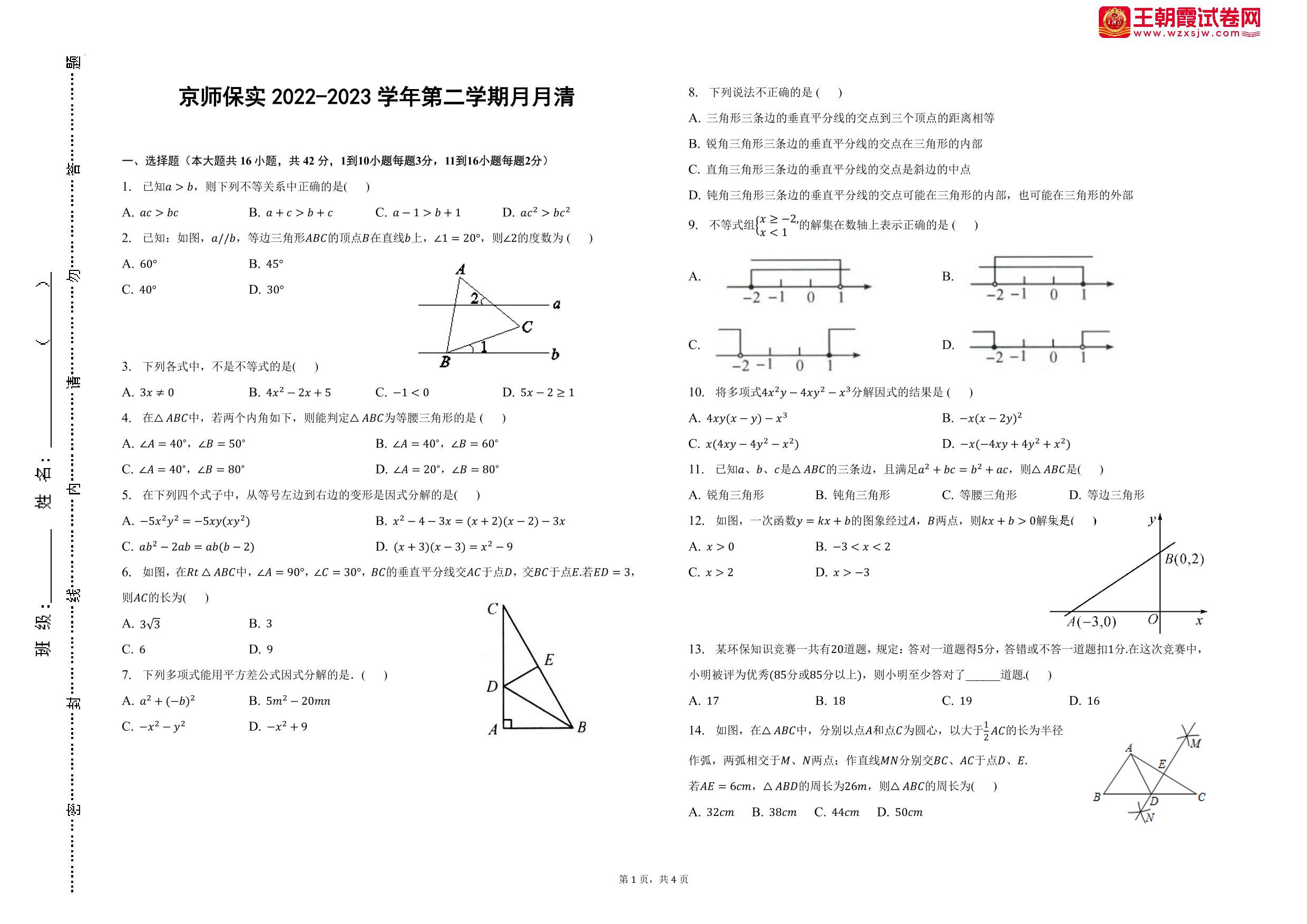 河北省北京师范大学保定实验学校2022-2023学年第二学期第一次月考八年级数学(北师版)