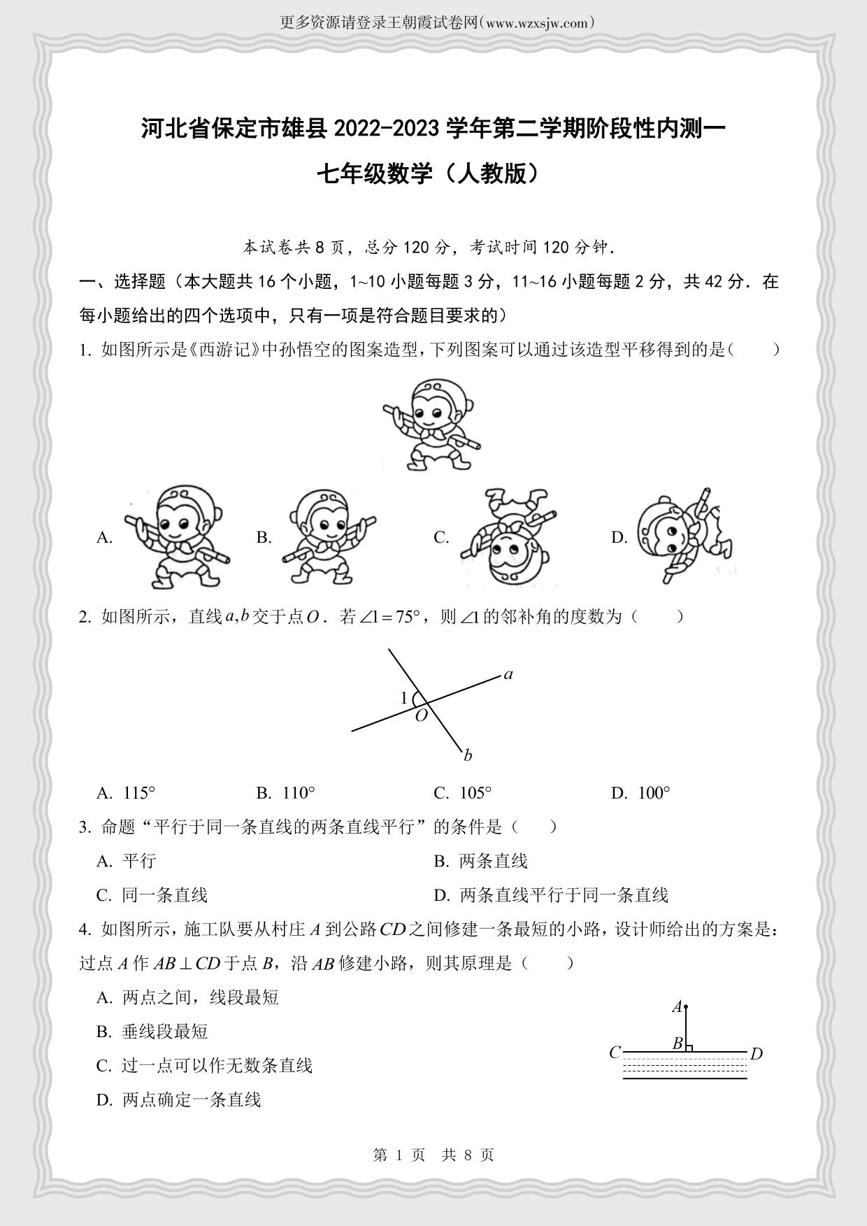 河北省保定市雄县2022-2023学年第二学期阶段性内测3月月考七年级数学(人教版)