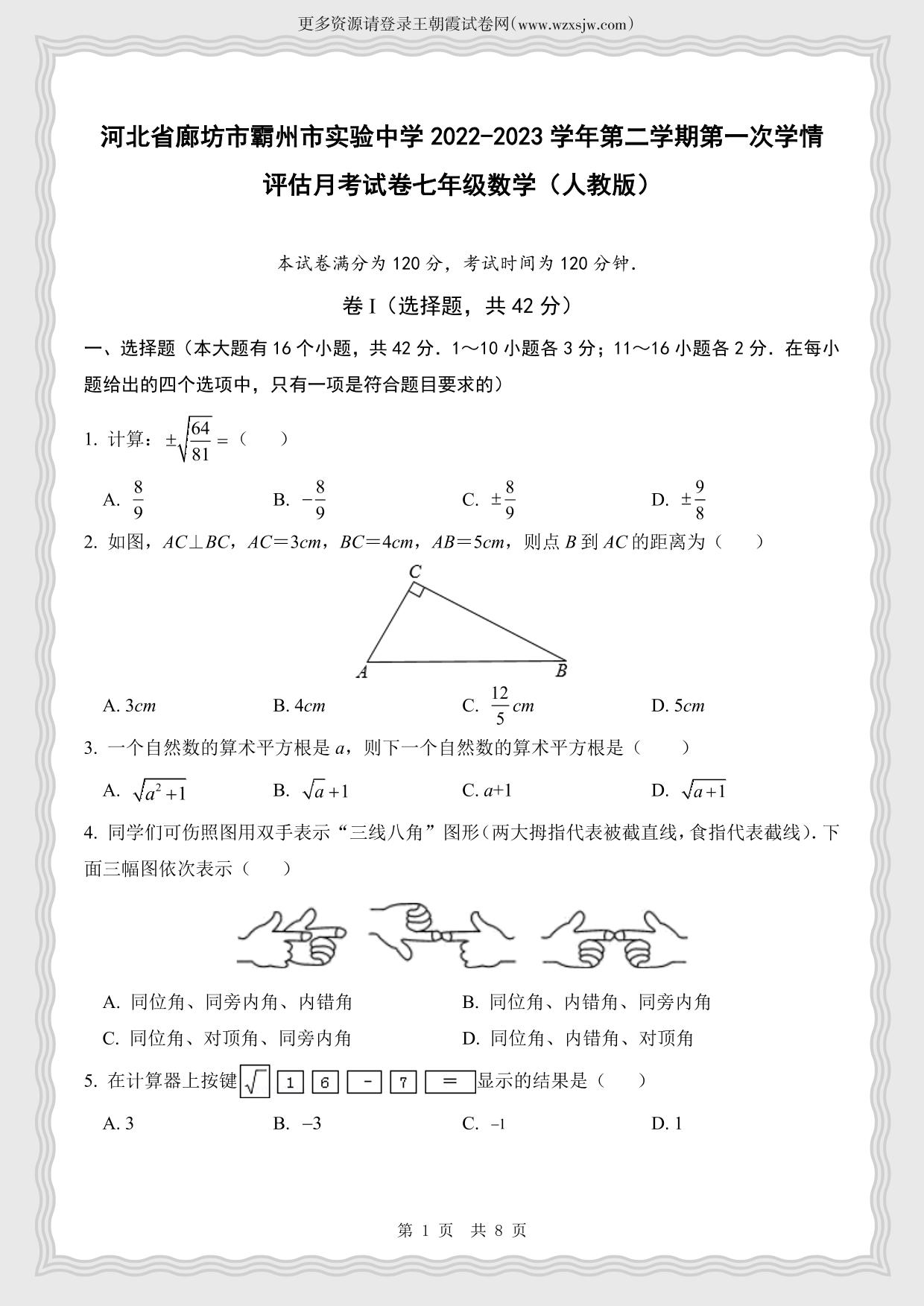 河北省廊坊市霸州市实验中学2022-2023学年第二学期第一次学情评估月考试卷七年级数学(人教版)
