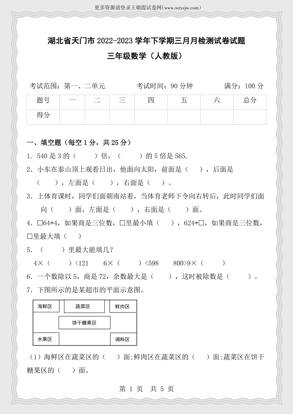 湖北省天门市2022-2023学年下学期三月月检测试卷试题三年级数学(人教版)