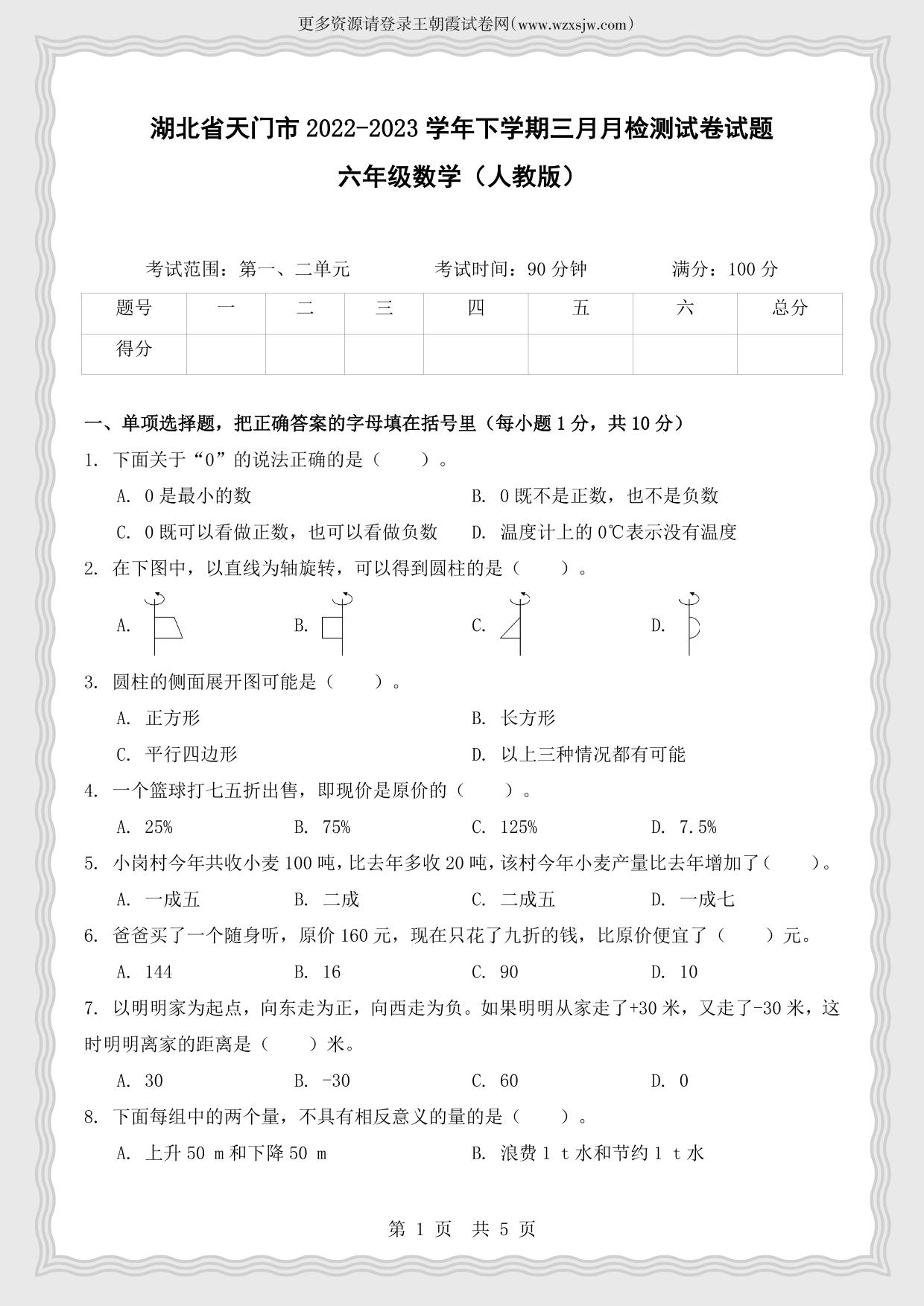 湖北省天门市2022-2023学年下学期三月月检测试卷试题六年级数学(人教版)